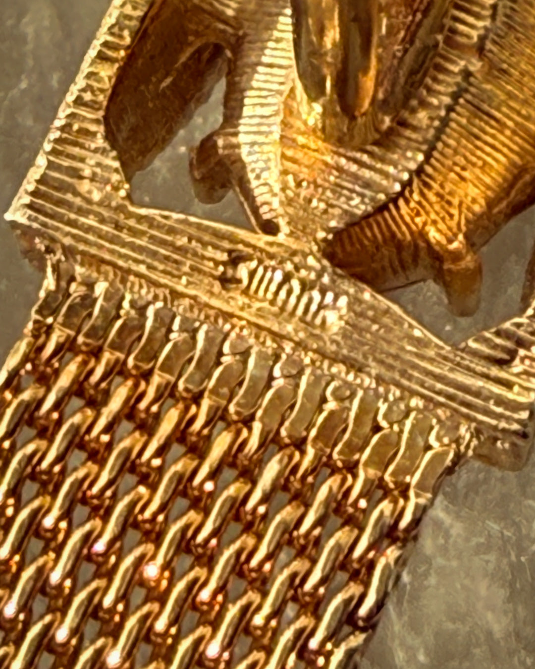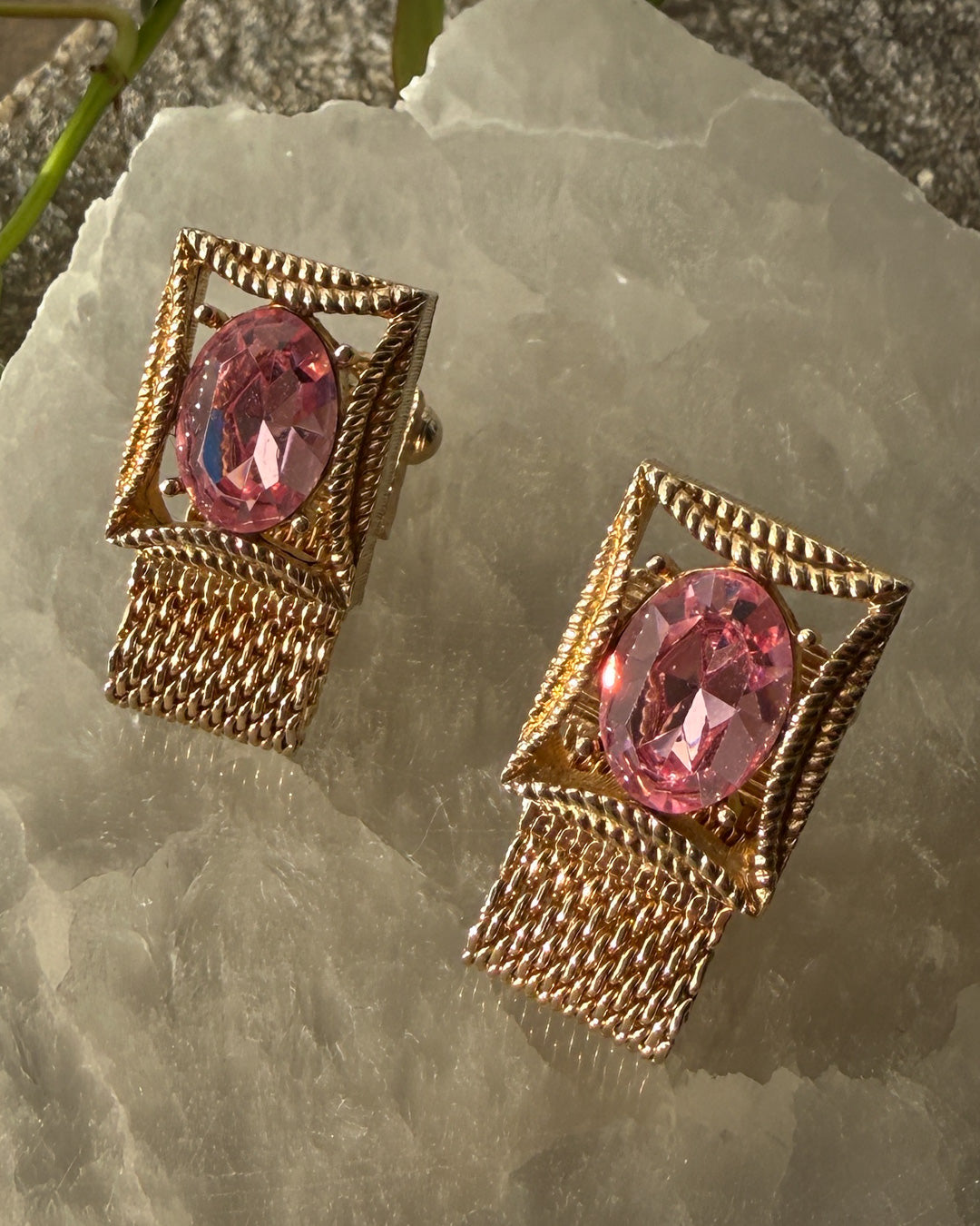 Vintage 1960s gold tone metal mesh rectangular cufflinks with pink faceted oval crystals. Signed: SwankLength: 1 1/4" (when fastened)Width: 5/8"'Excellent pre-owned condition- may show minor signs of light, normal wear.