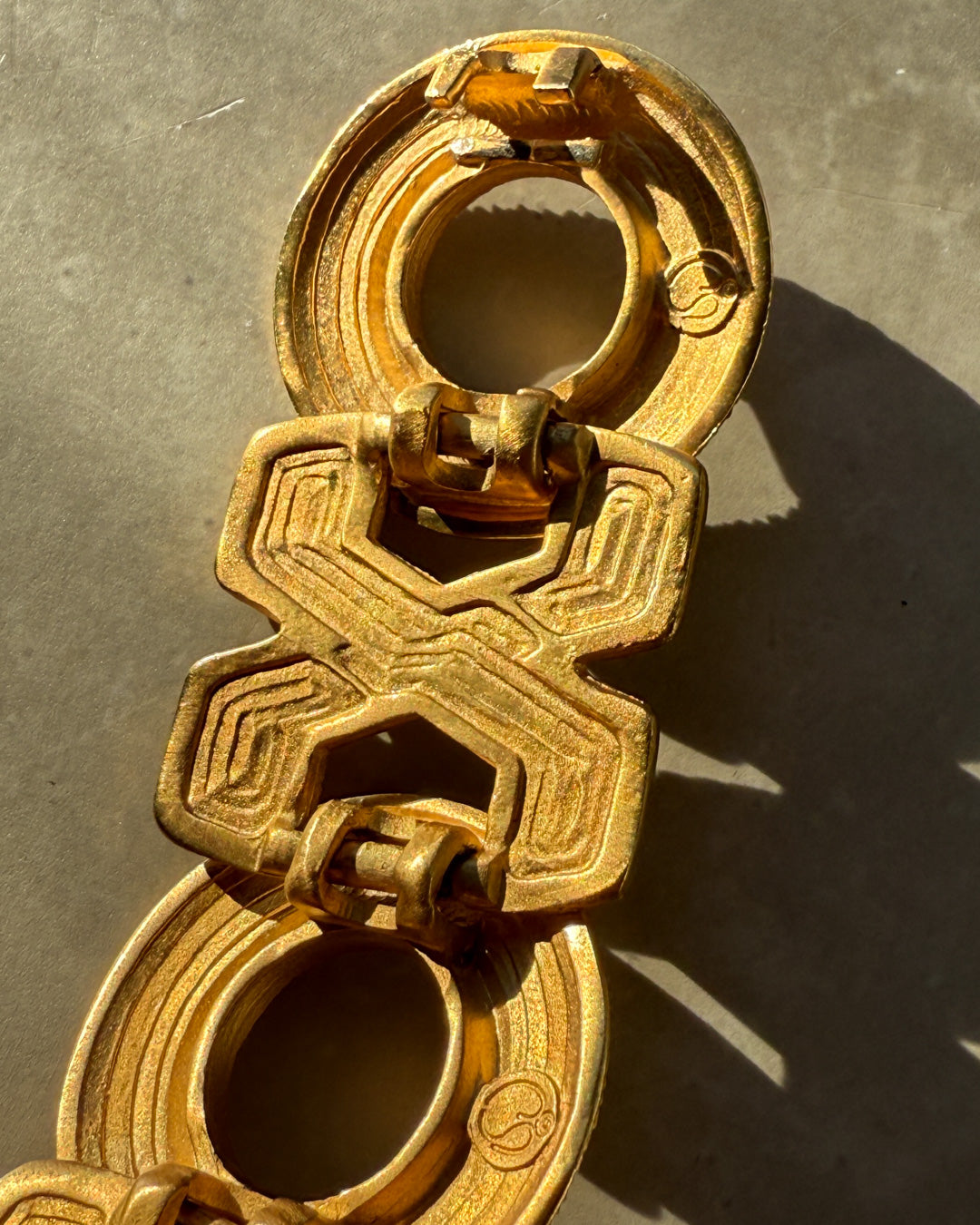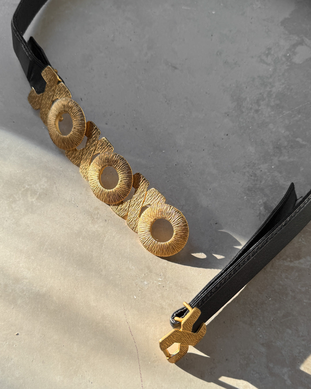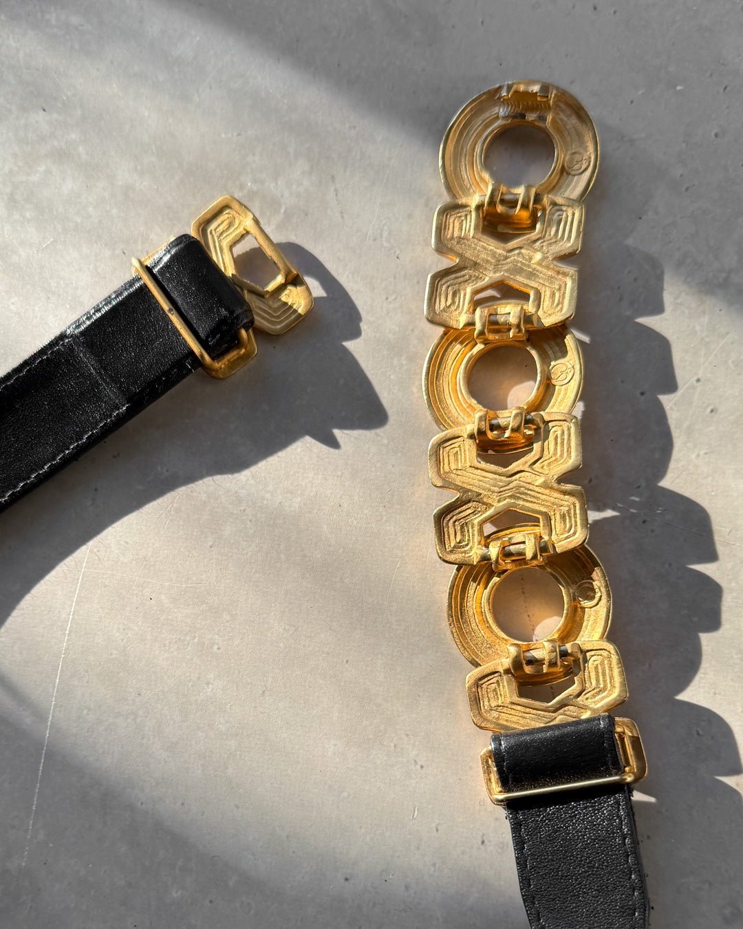 Vintage 1990s St. John black leather belt with textured yellow gold tone hugs & kisses belt buckle. Hook closure; fully adjustable.