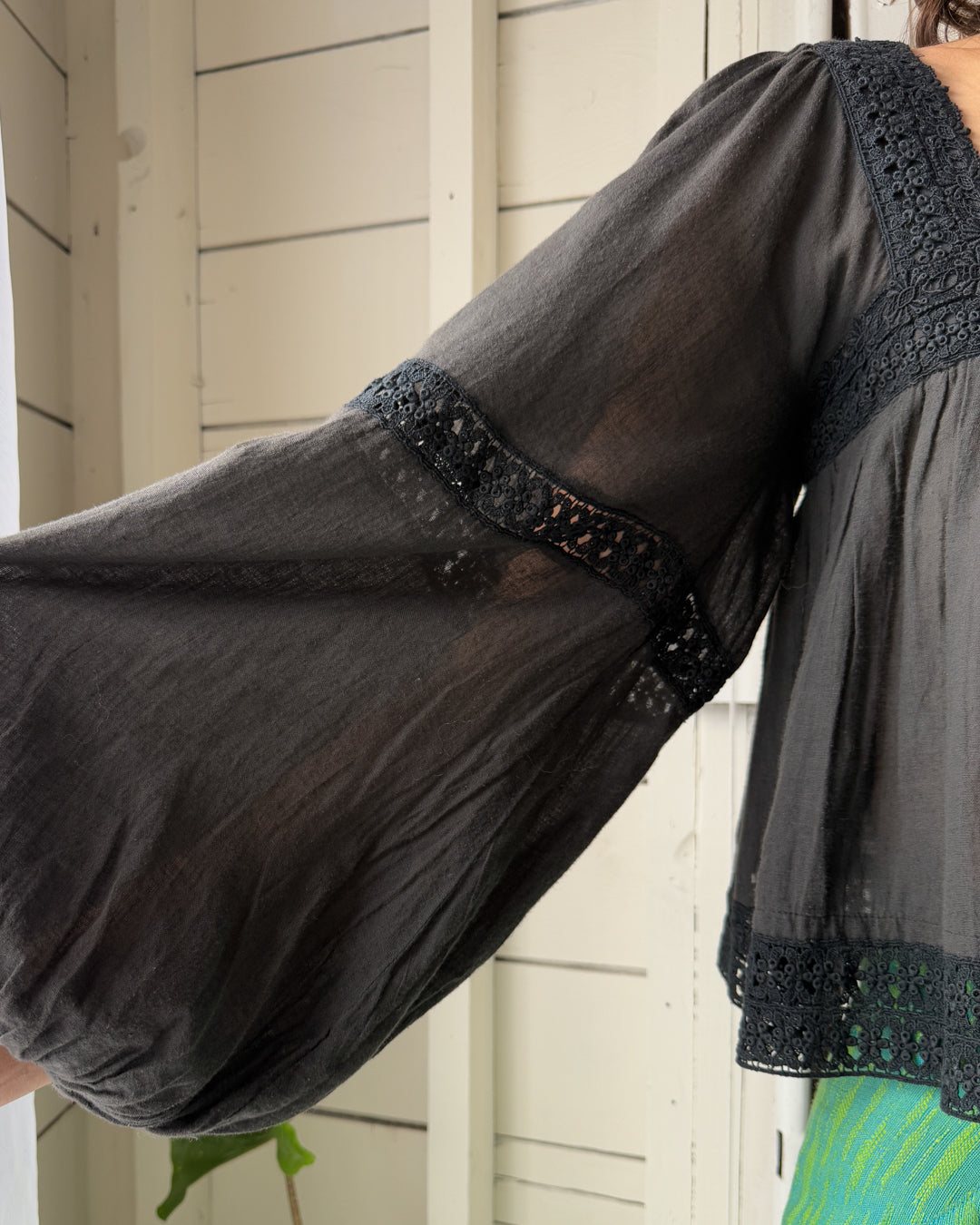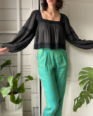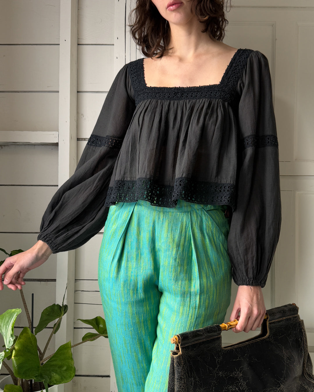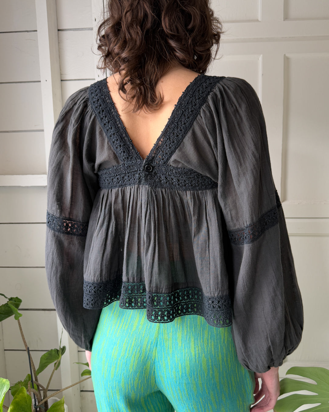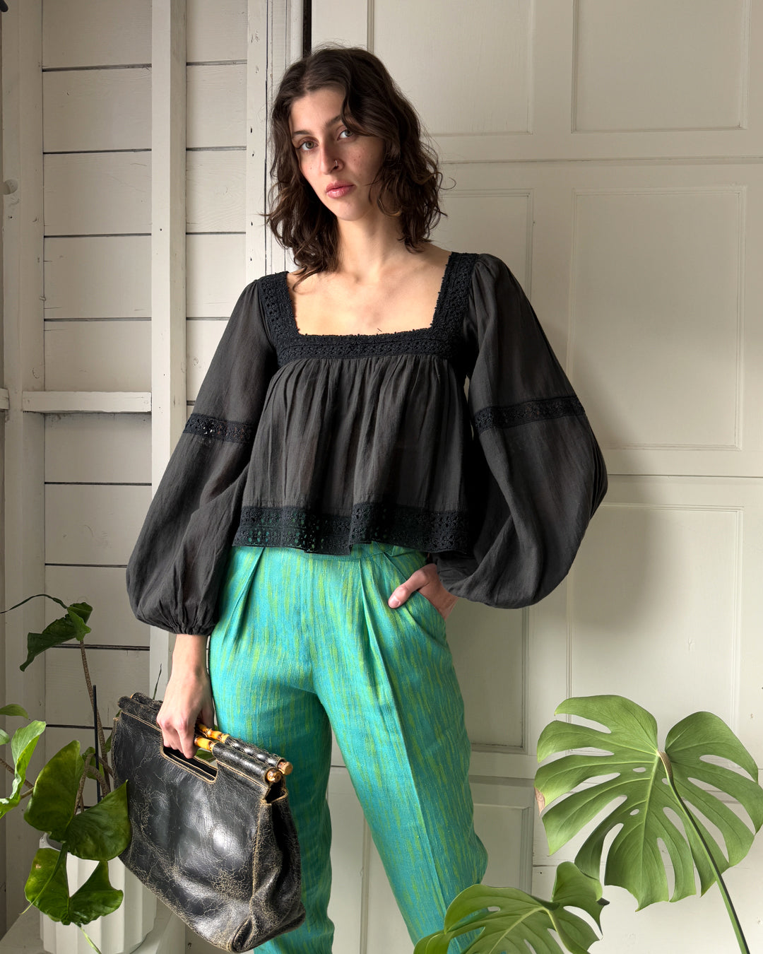 Vintage 1980s Kansai Yamamoto gauze cotton blouse with huge balloon sleeves and lace trim.