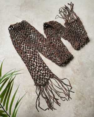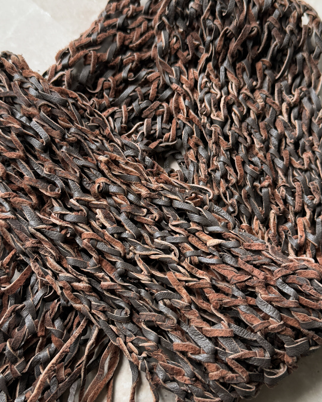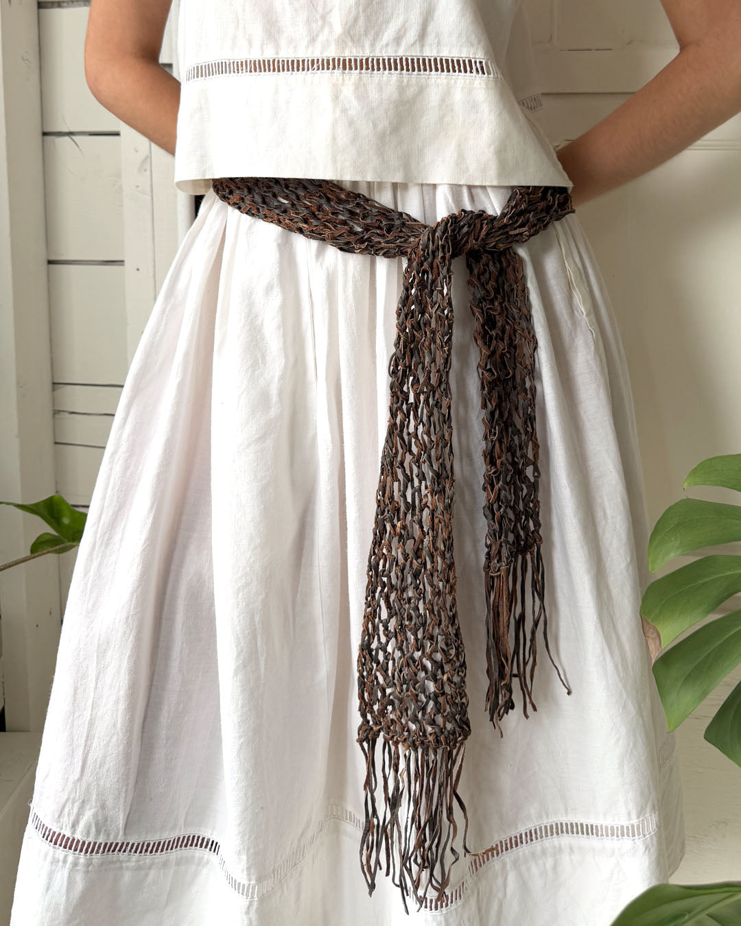 Vintage 1990s soft two tone brown woven leather tie belt with fringe ends.