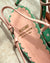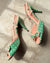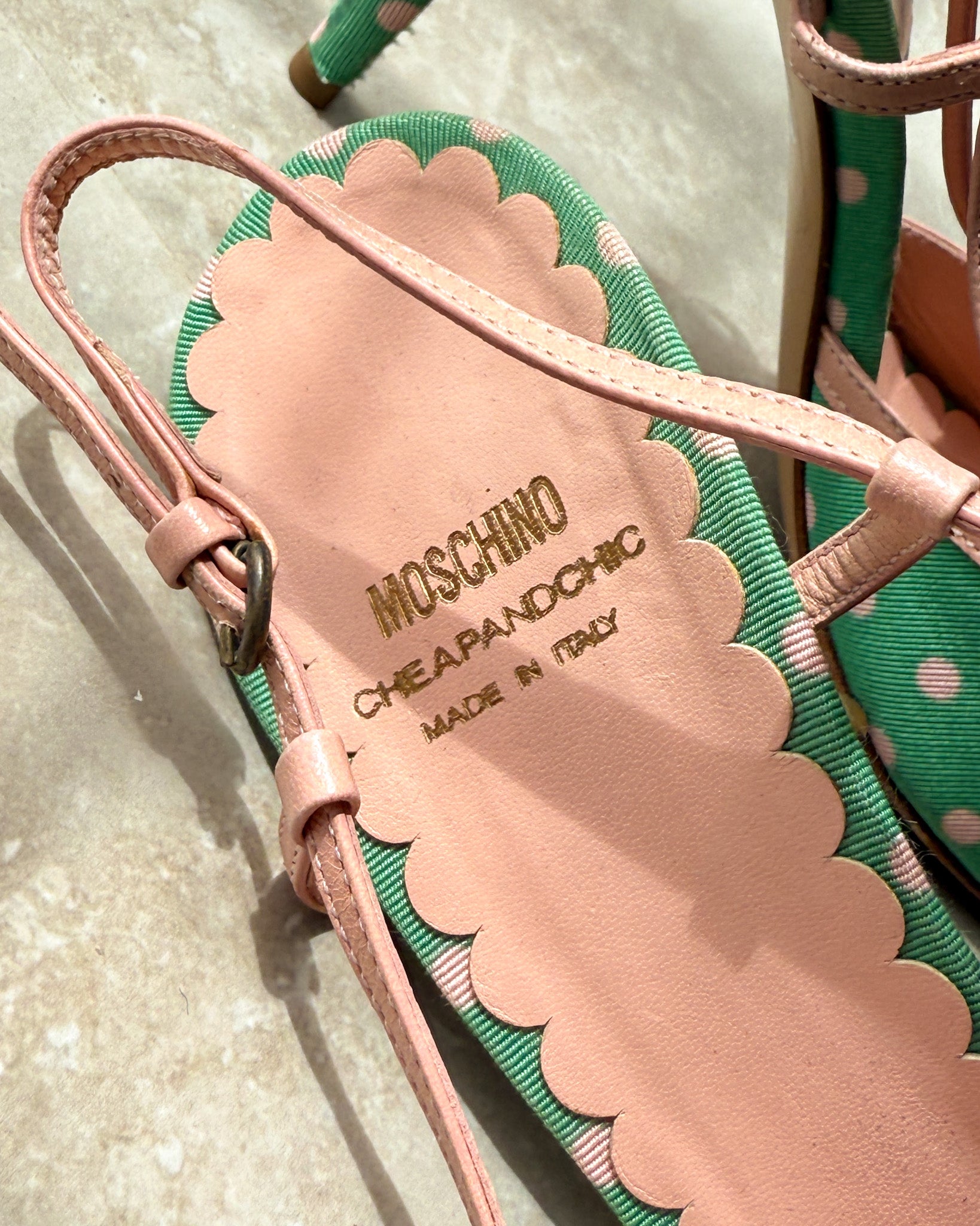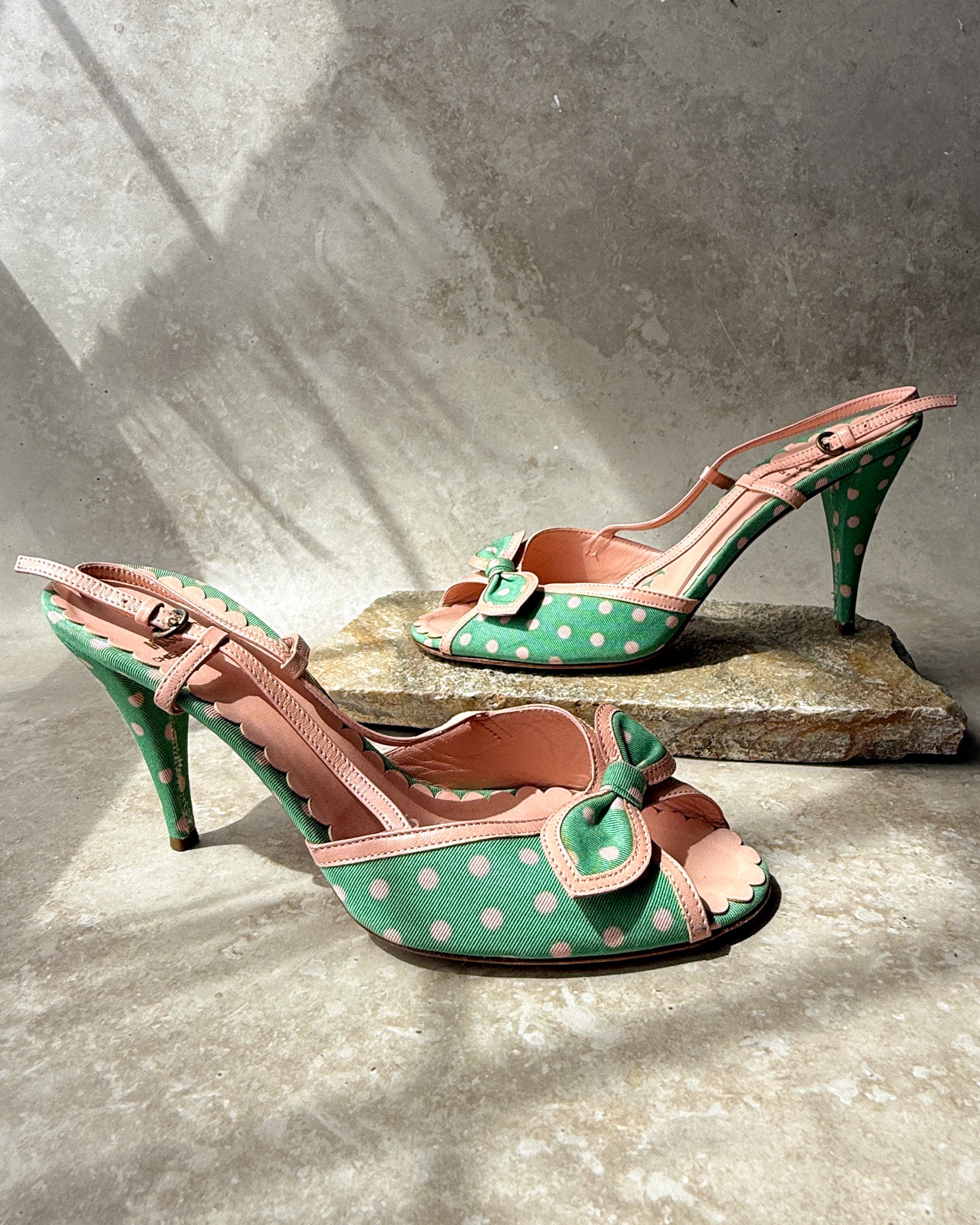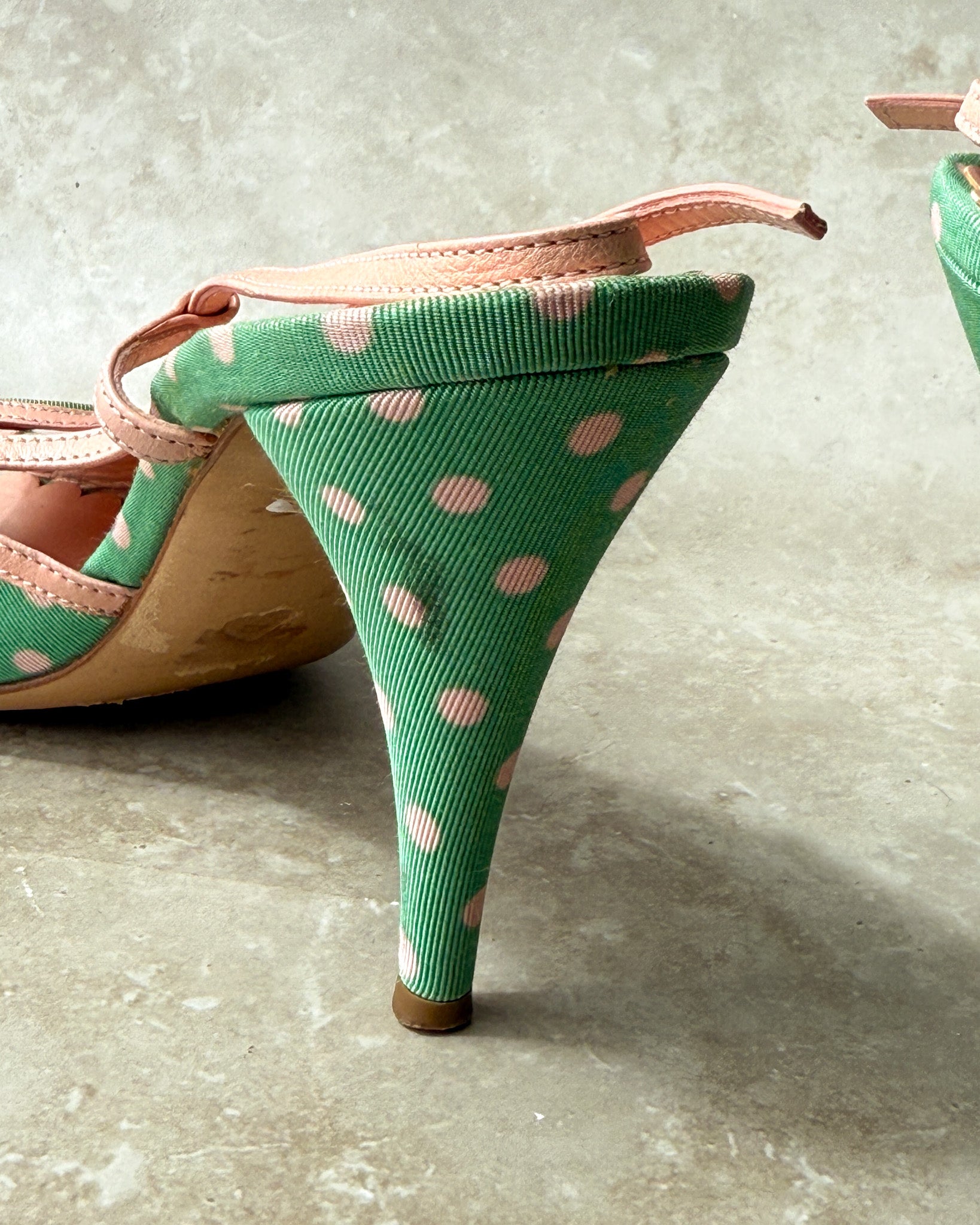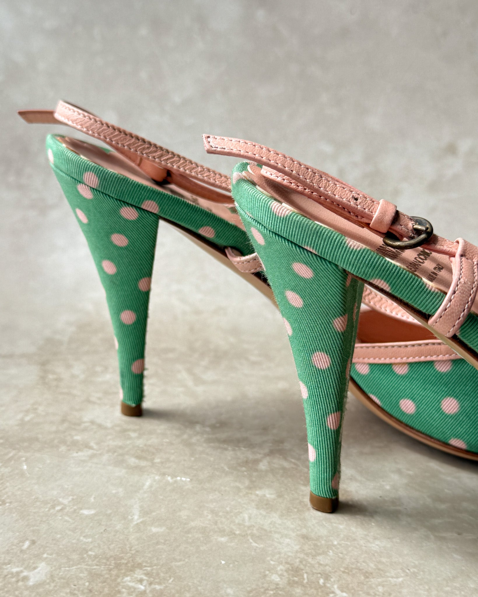Vintage 1990s Moschino mint green & pink polka dot heels with peachy pink leather trim. Peep toes with cute bows. Slingback straps with adjustable buckle closures. Leather soles. Made in Italy.