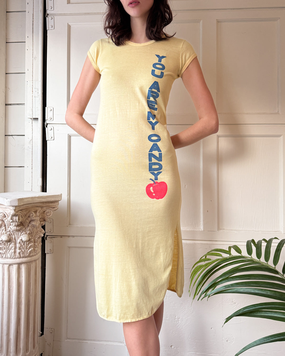 Vintage 1970s novelty print yellow cotton t-shirt maxi dress.