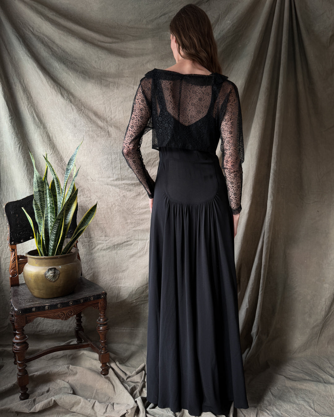 Vintage 1940s jet black gown with long sheer lace sleeves and bodice.