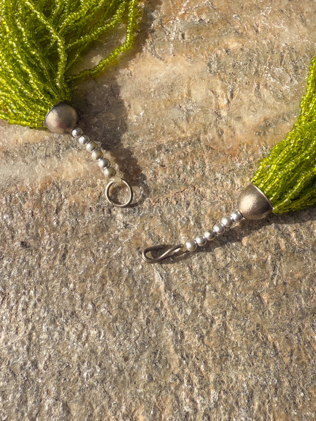 Vintage artisan-made multi-strand necklace with dainty lime green glass seed beads. Hook closure. Unsigned.