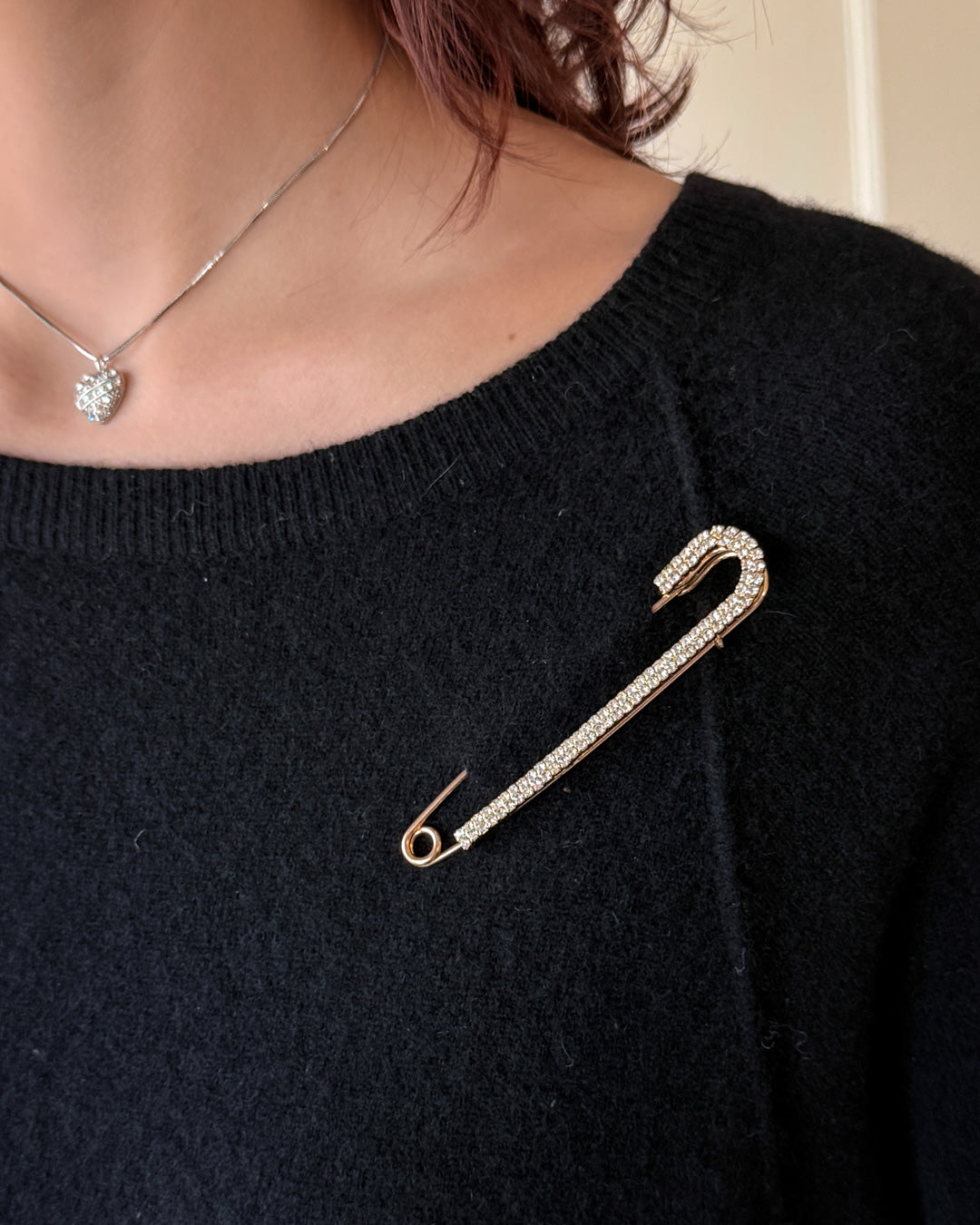Vintage Swarovski gold tone metal oversized kilt pin brooch encrusted with sparkly pavé crystals.Marked: SwarovskiLength: 4"Width: 3/4"Excellent pre-owned condition- box has some damage from tape. May show other signs of normal wear.