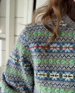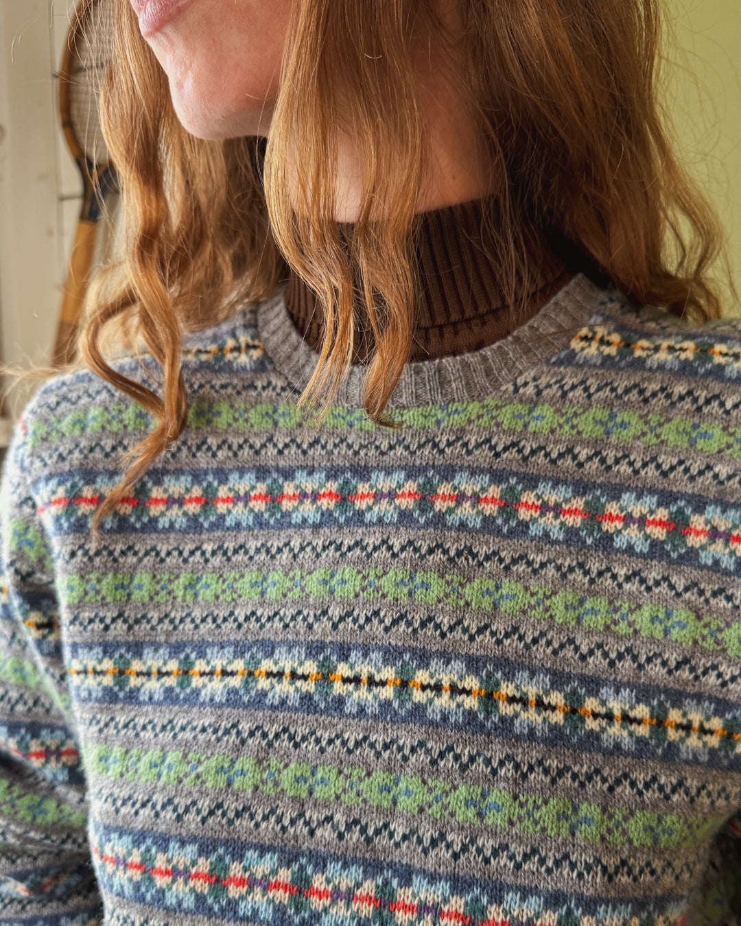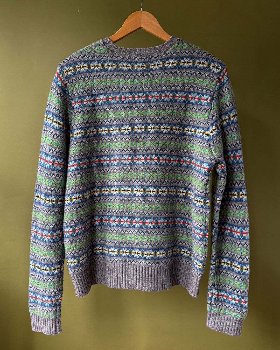 Vintage men's Ralph Lauren ultra soft gray, green & blue fair isle wool pullover sweater with rib knit crew neck, waistband and cuffs. Unlined.