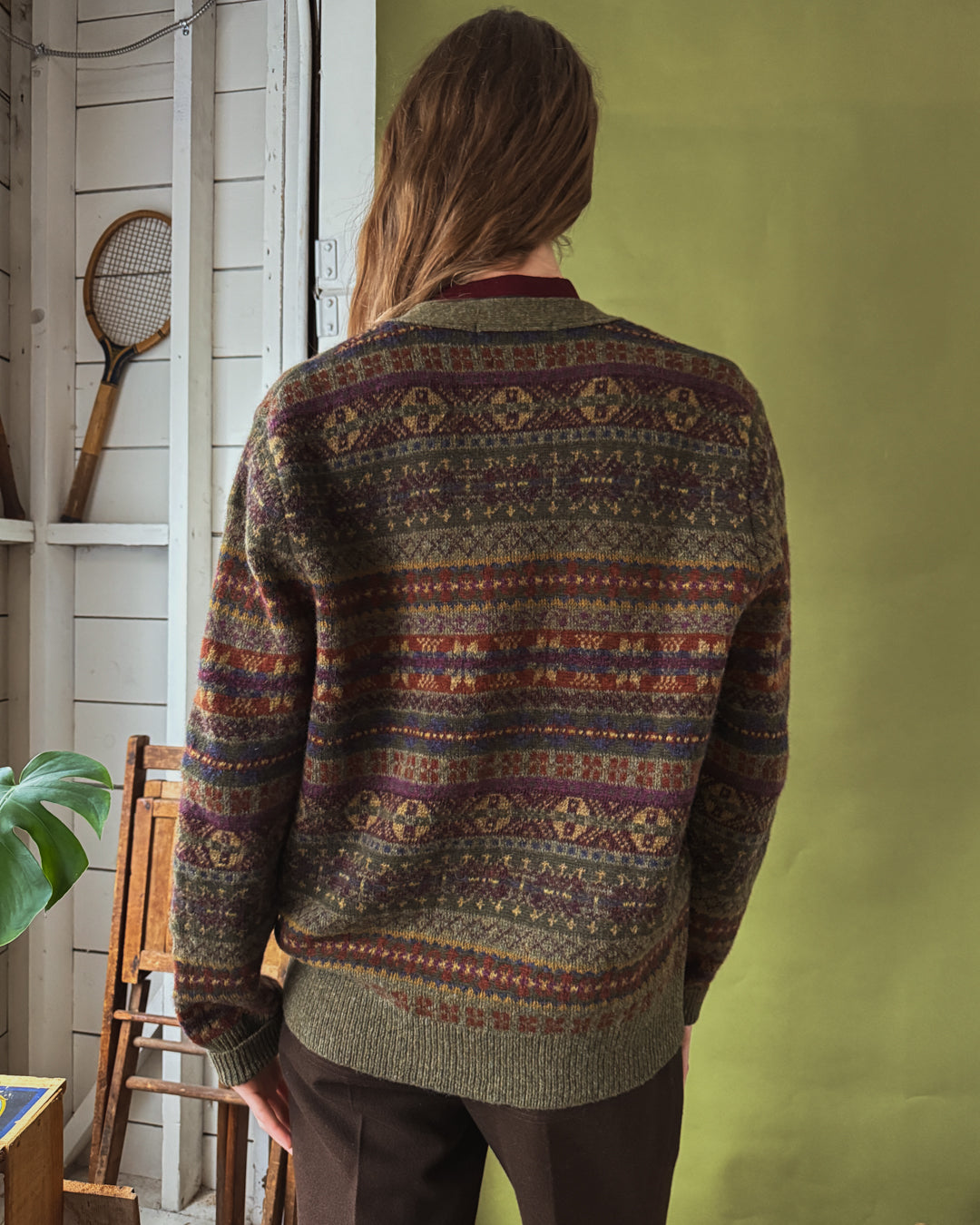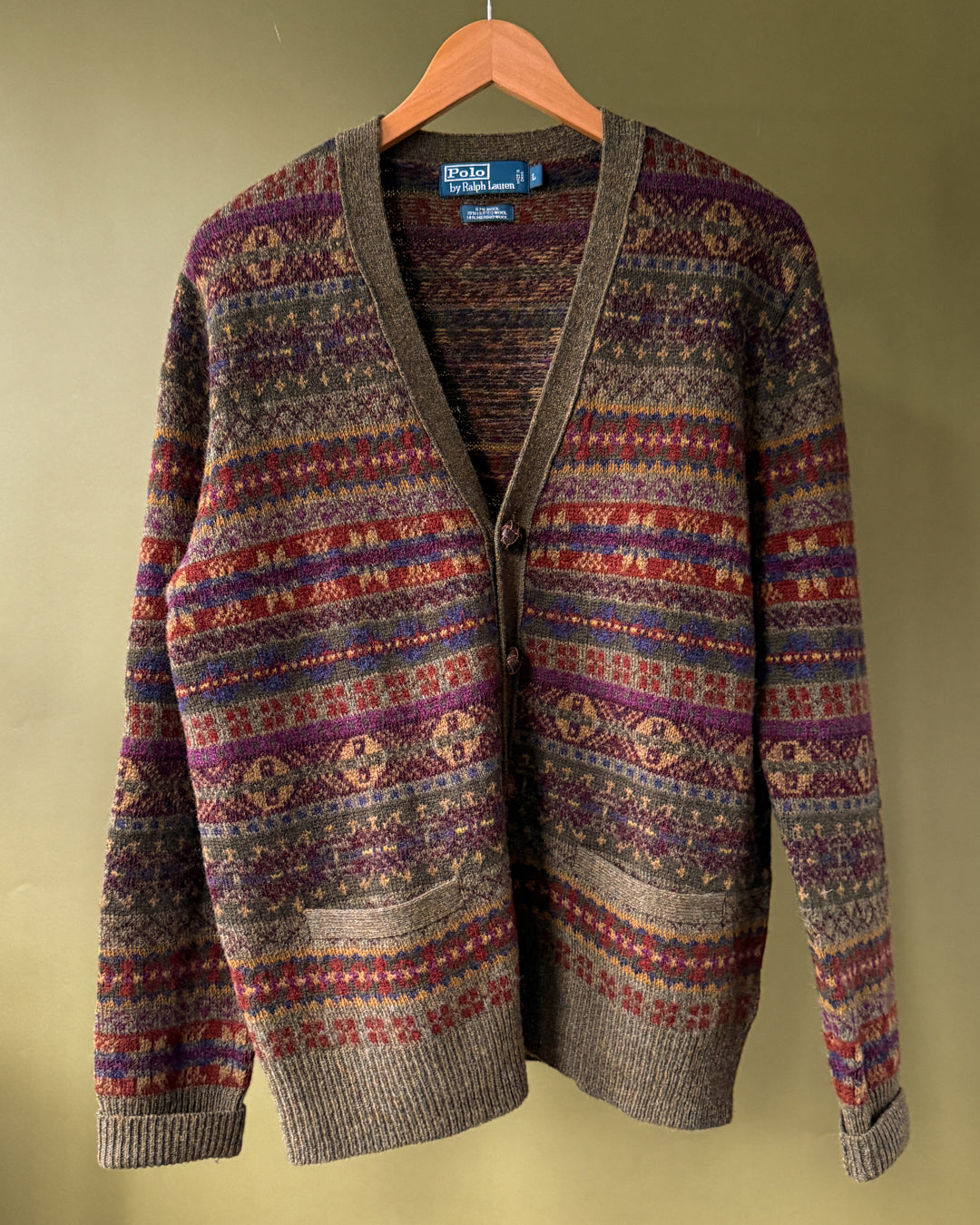 Vintage men's Ralph Lauren multicolored wool blend fair isle knit sweater. Deep v neckline, leather button front closures and two front patch pockets. Unlined.