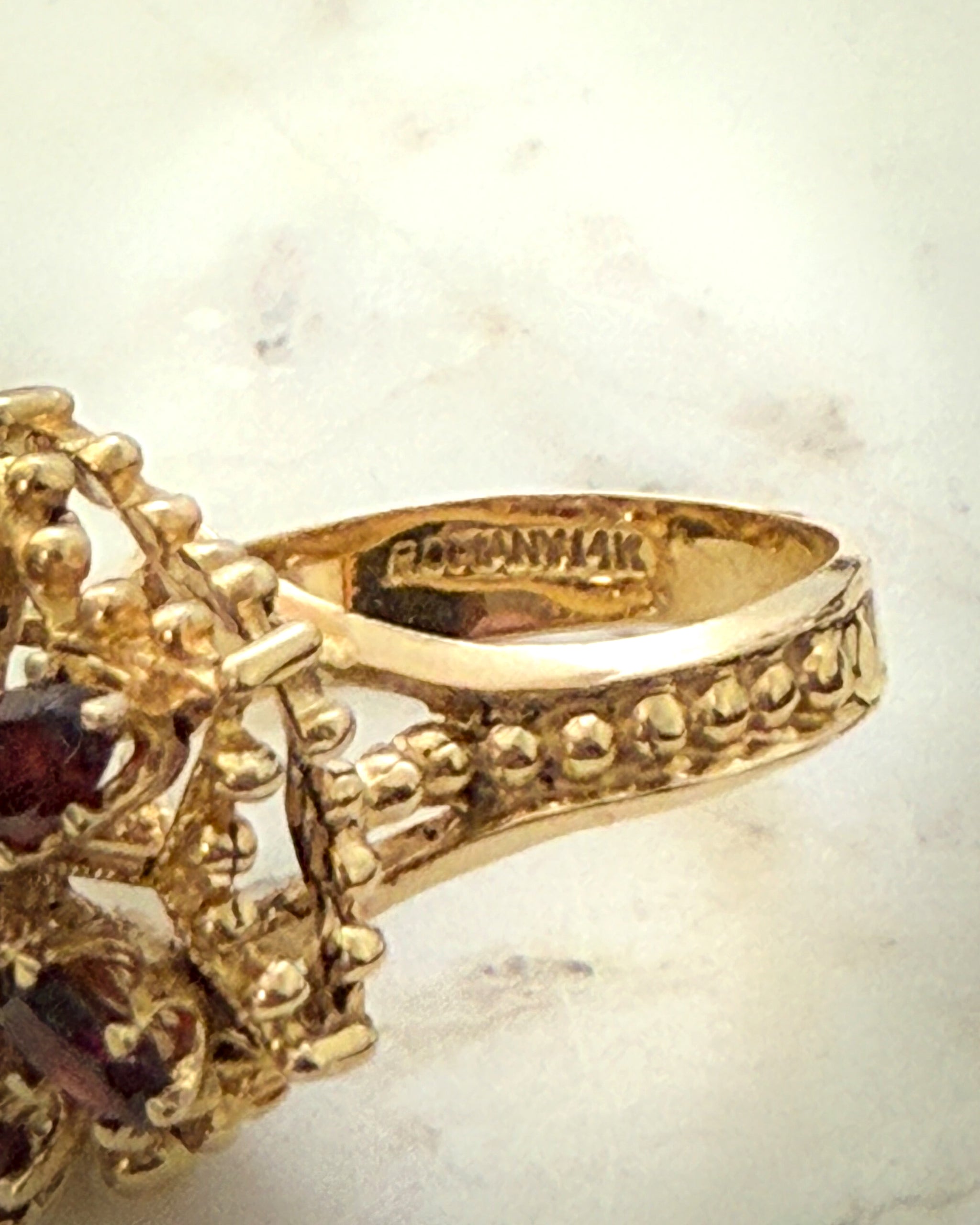 Vintage 14 karat gold cluster ring with bohemian garnets.