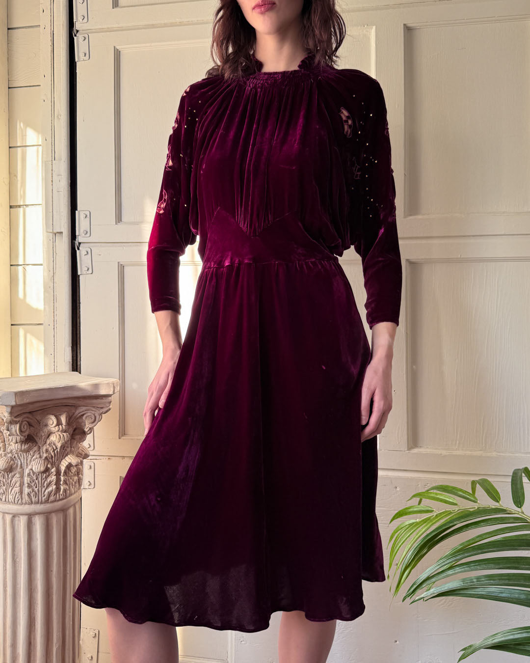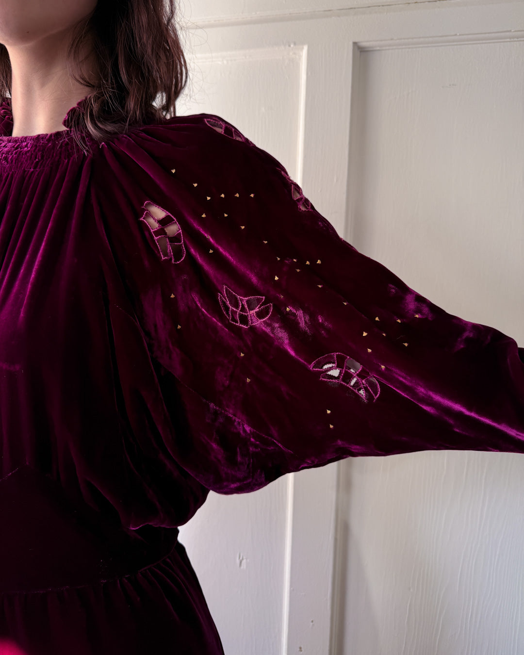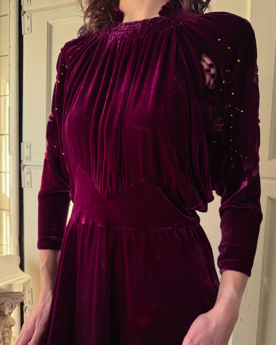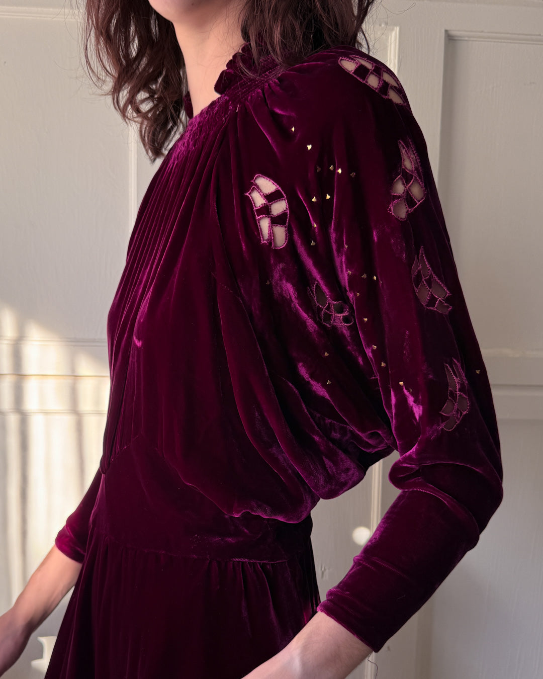 Vintage 1930s plum silk velvet dress with brass studs and open sleeve cutouts.