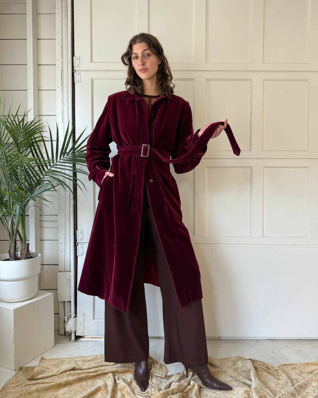 Vintage 1970s deep wine velvet maxi trench coat with belted cuffs and waist.