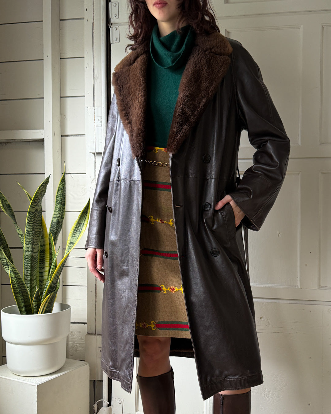 Vintage men's 1980s dark brown long leather coat with plush genuine sheared fur lining. Made in Italy.