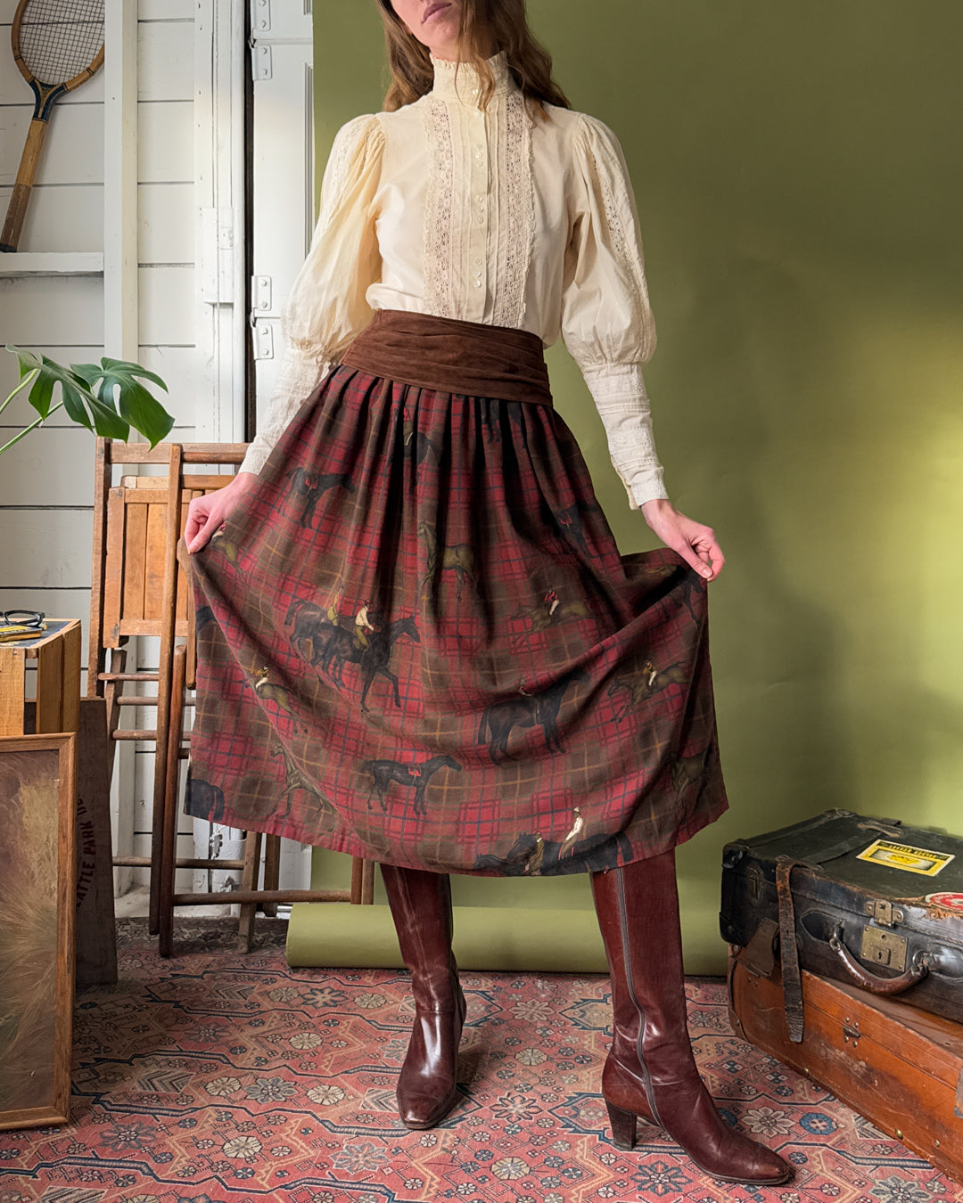 Vintage 1980s Ralph Lauren plaid wool blend midi skirt with novelty horse pattern.