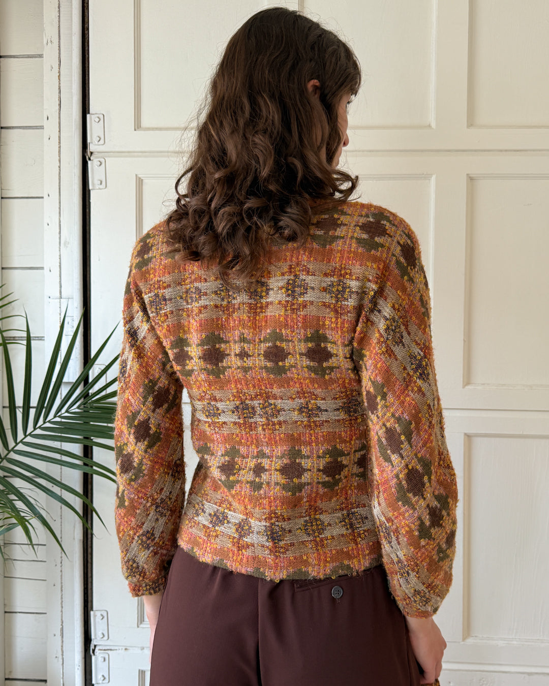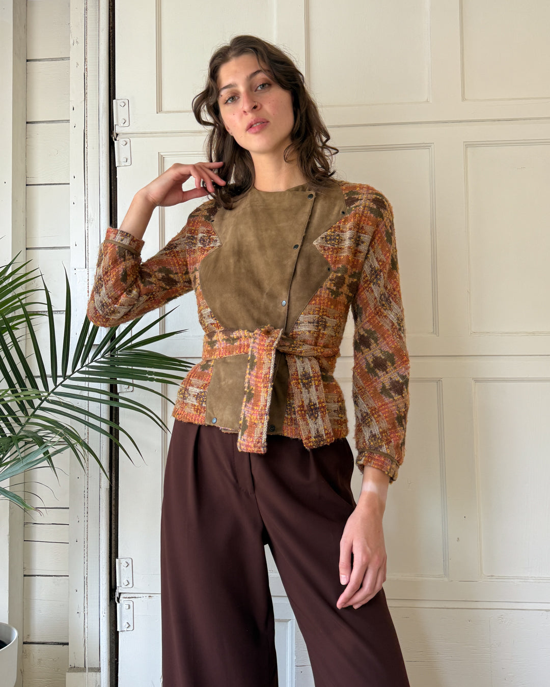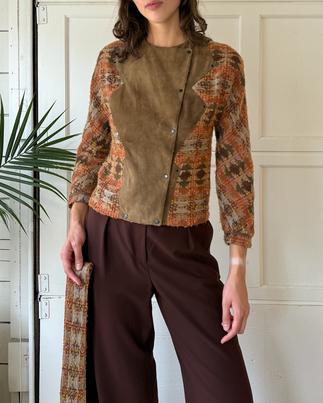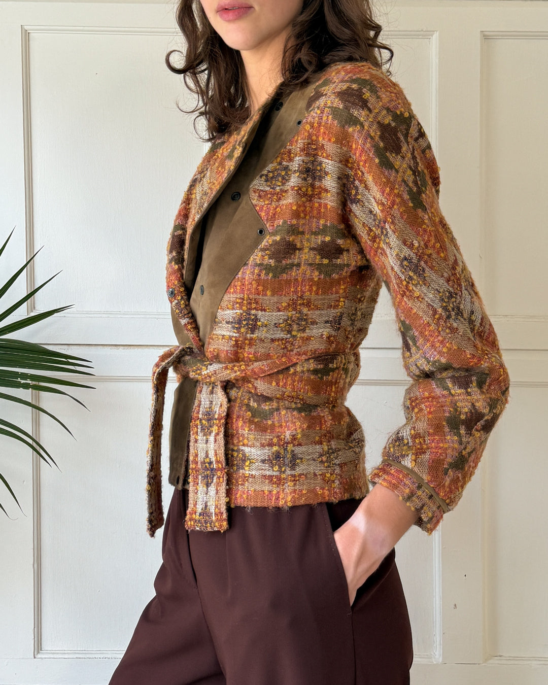 Vintage 1980s colorful woven wool cropped jacket with brown suede trim and matching belt.