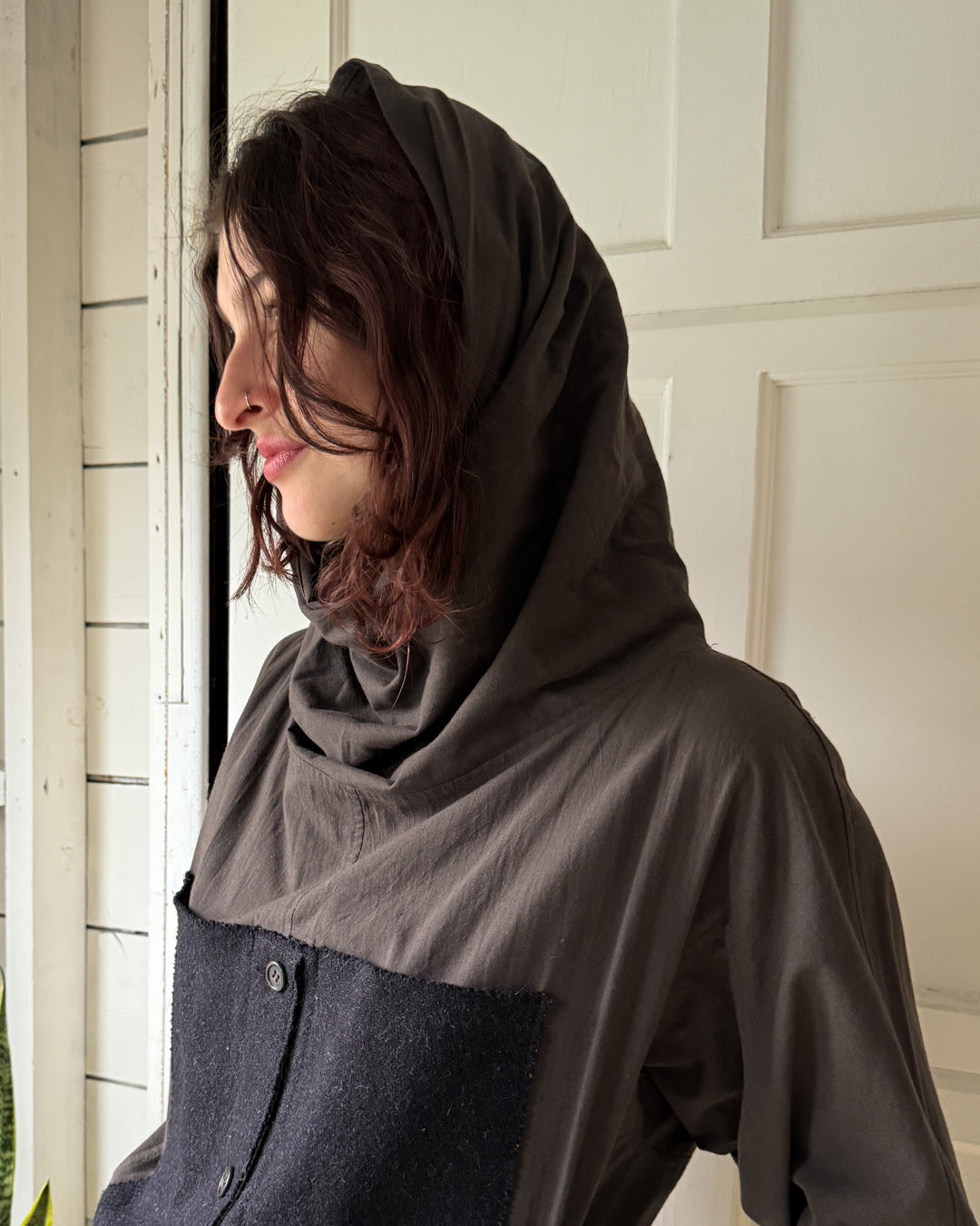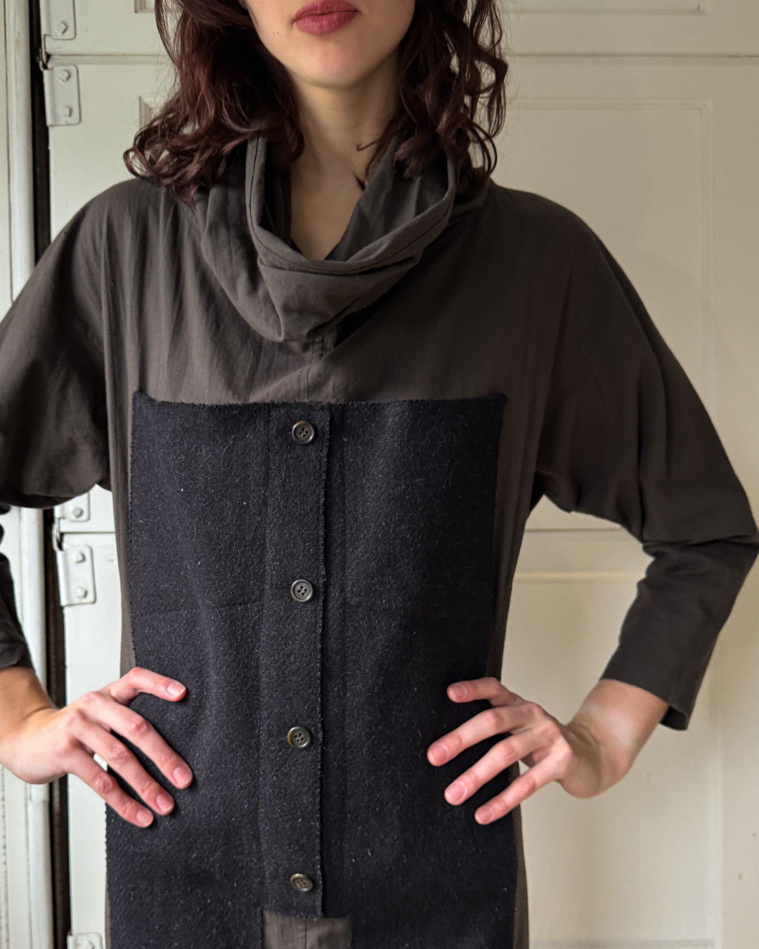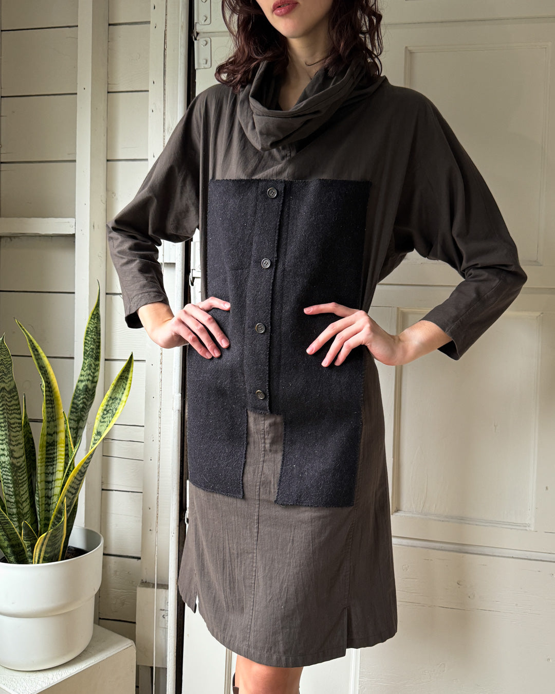 Vintage 1980s Yohji Yamamoto gray cotton dress with black wool panels and large cowl neck.