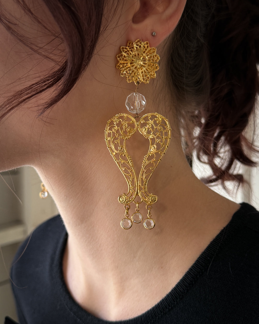 Vintage 1990s gold tone pressed metal statement earrings with clear faceted lucite details. Clip on closures. Lightweight & comfortable to wear.