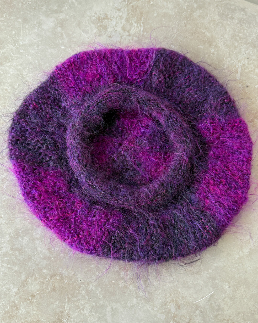Vintage 1990s soft hand knit mohair beret. Two tone purple shaggy textured knit.