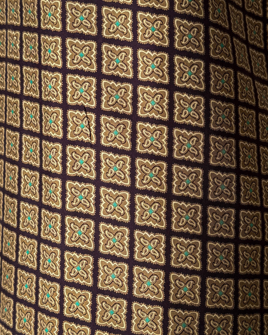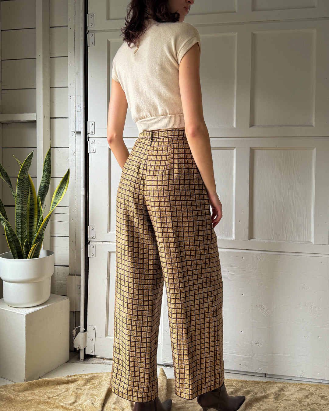 Vintage 1990s silk tile print wide leg pants with matching wide sash scarf tie belt. Side seam pockets. Fully lined.