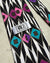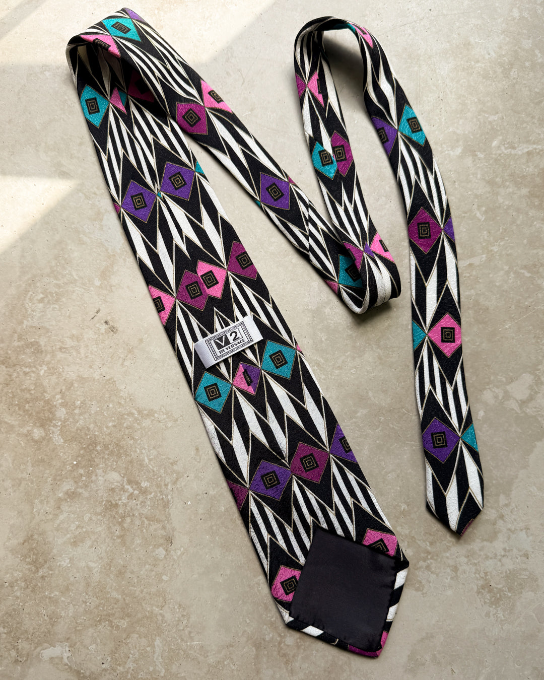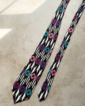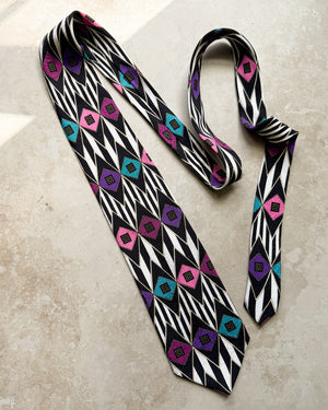 Vintage Versace V2 100% silk necktie. Black & white geometric print with violet, magenta and teal accents.