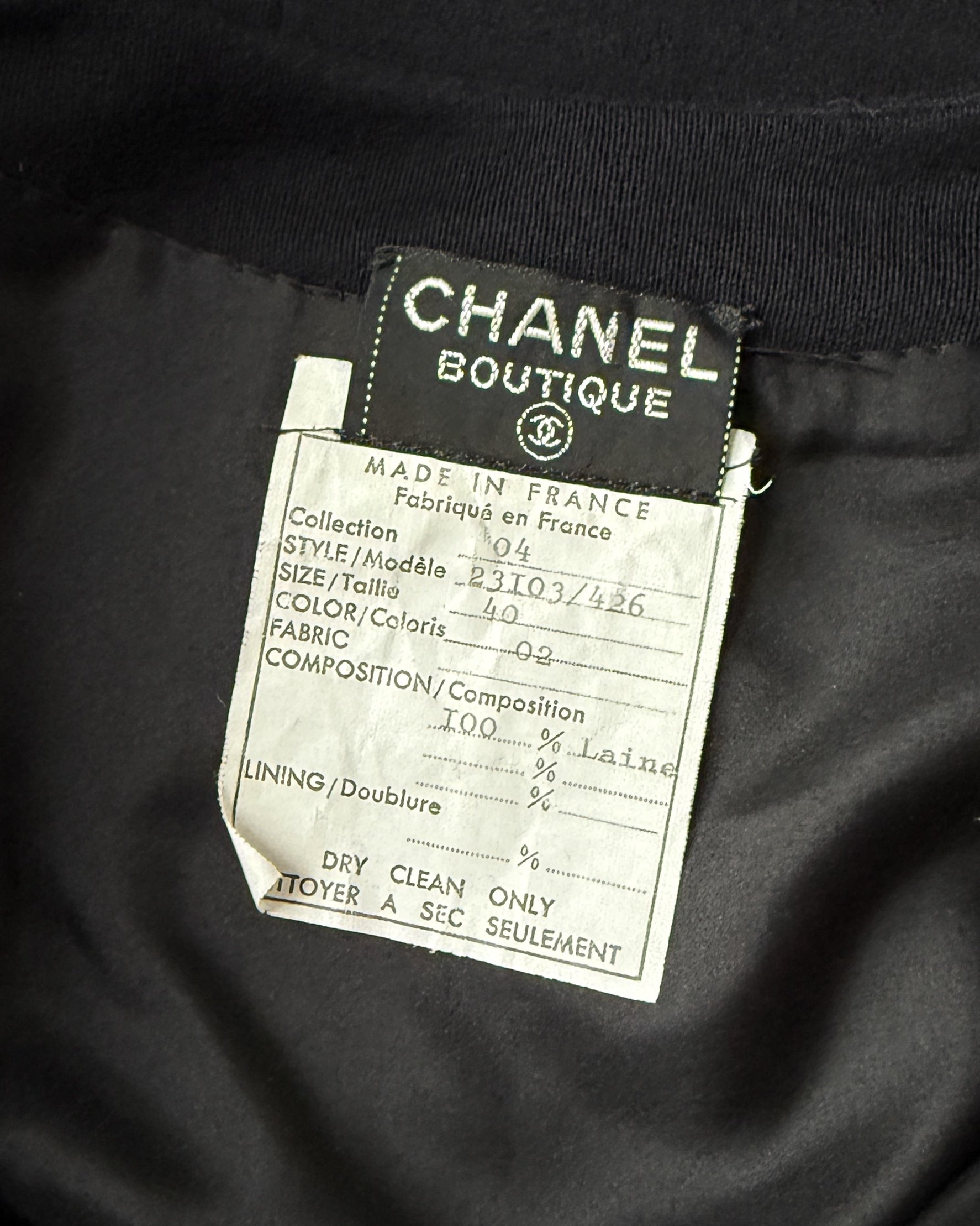 Vintage 1990s Chanel navy blue wool maxi dress with box pleated mermaid hem.