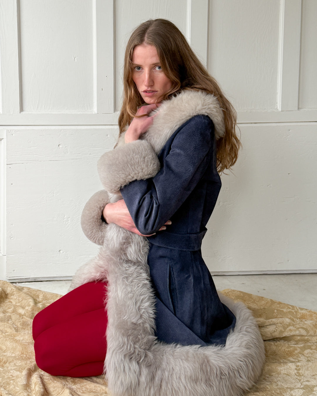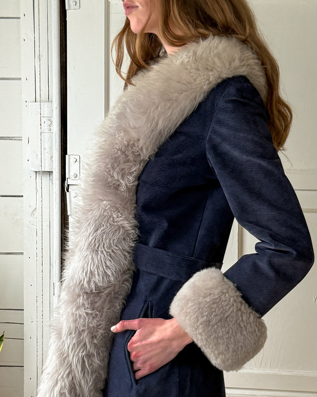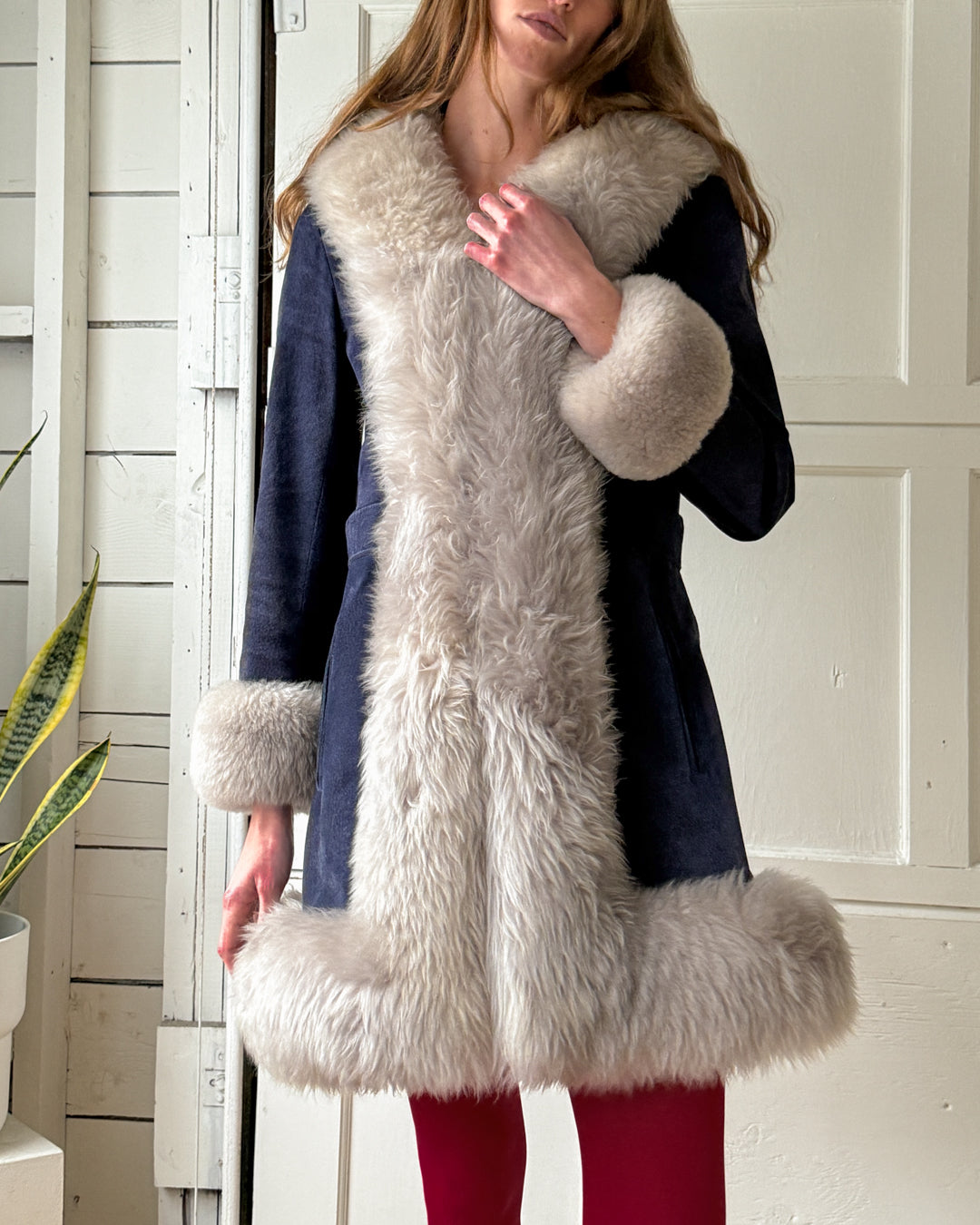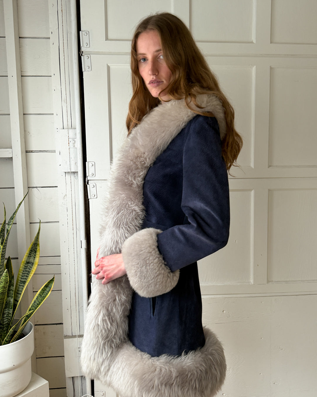 Vintage 1970s dark blue suede jacket with fluffy gray fur trim.