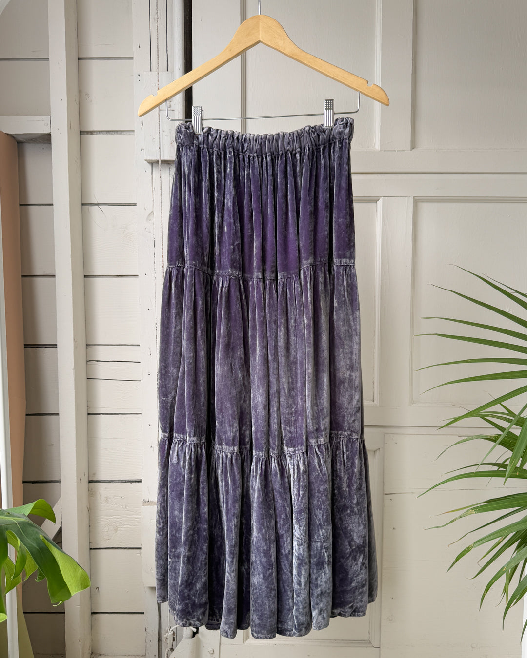 Vintage 1990s periwinkle crushed velvet tiered midi skirt with elastic waistband.