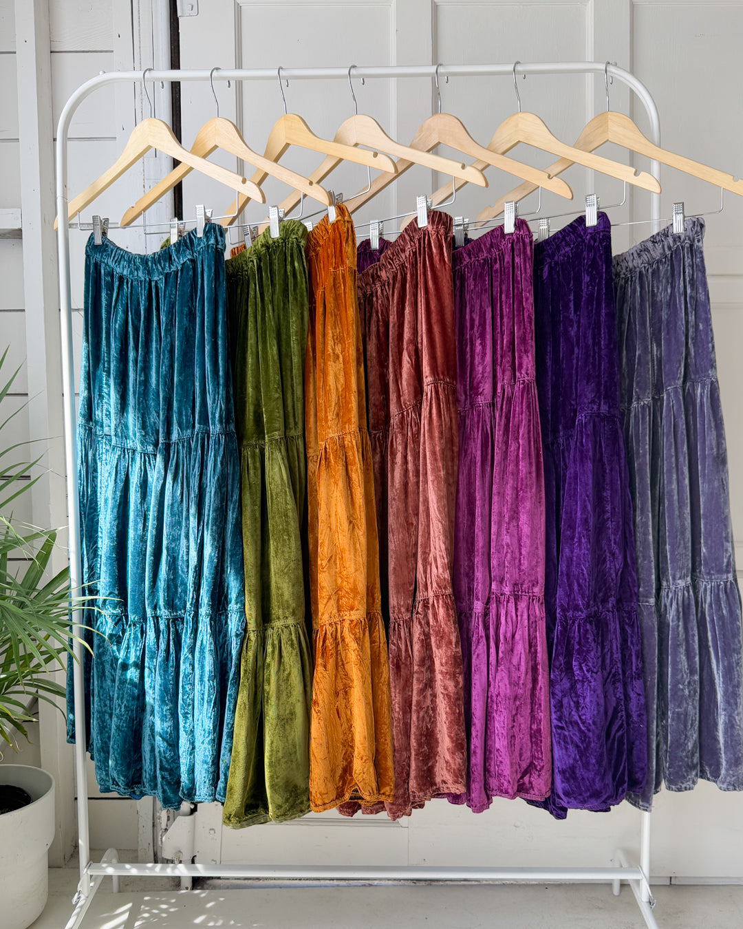 Vintage 1990s turquoise crushed velvet tiered midi skirt with elastic waistband.