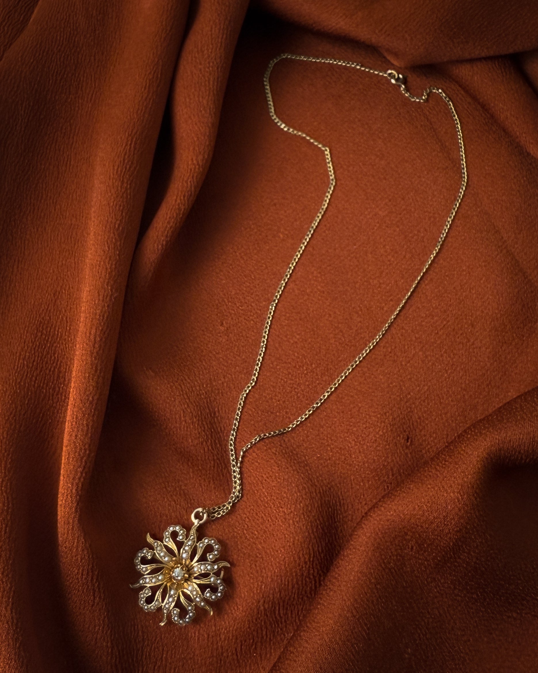 Antique Victorian 14 karat gold convertible edelweiss flower pendant with tiny seed pearls and a small diamond center. Gold filled chain with spring ring clasp. Pendant can be removed from the chain and worn as a brooch.