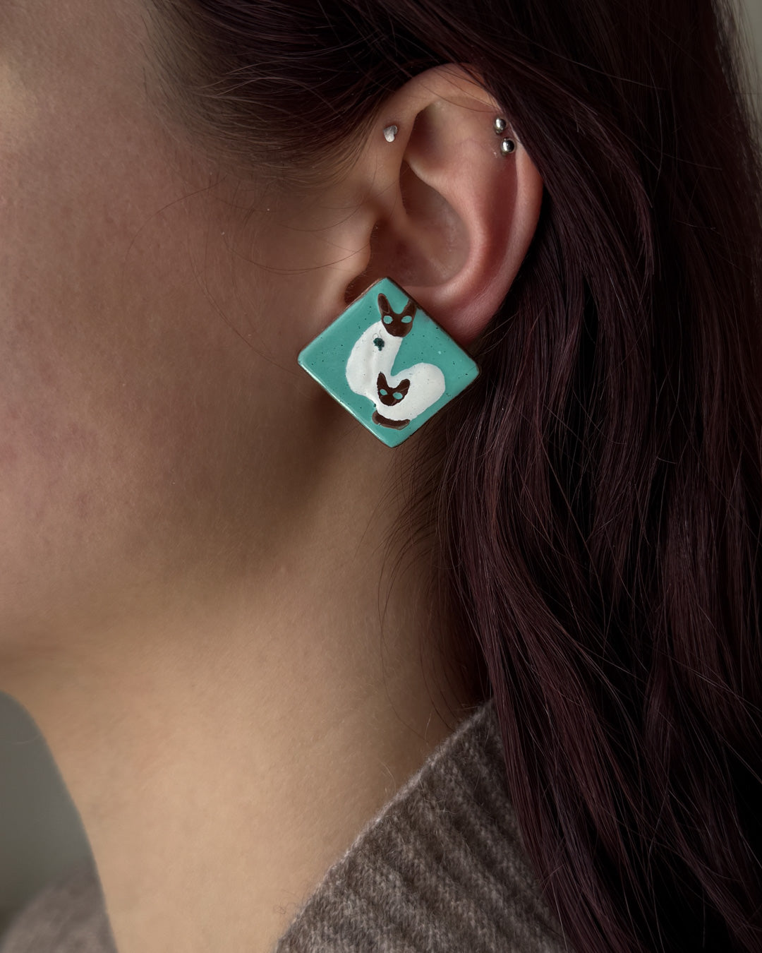 Vintage 1950s enameled copper cat earrings. Brown & white Siamese cats against a bright aqua background. Screw backs for pierced or unpierced ears.