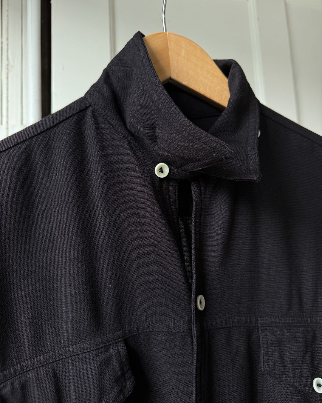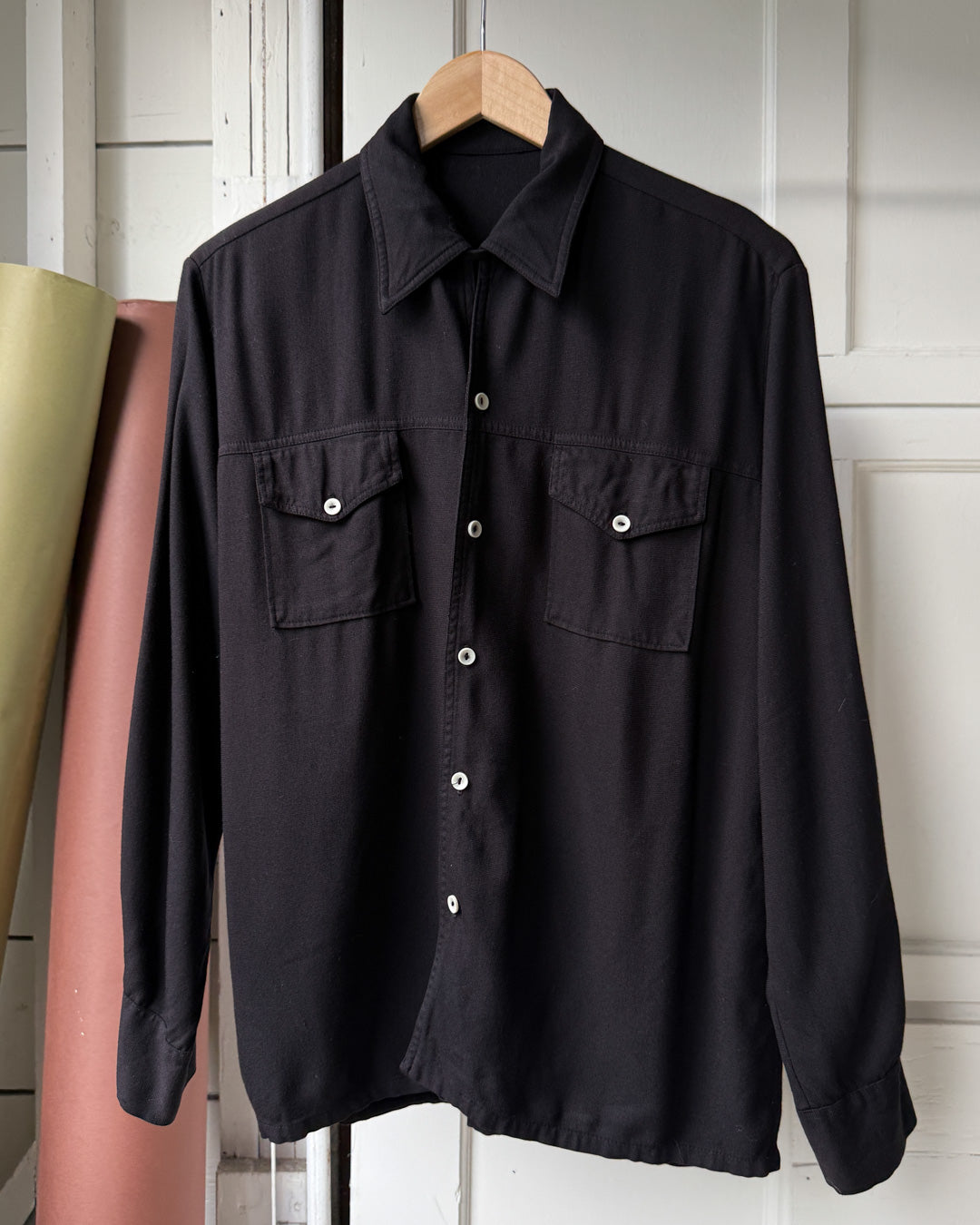 Vintage early 1960s men's black rayon loop collar shirt with pockets.