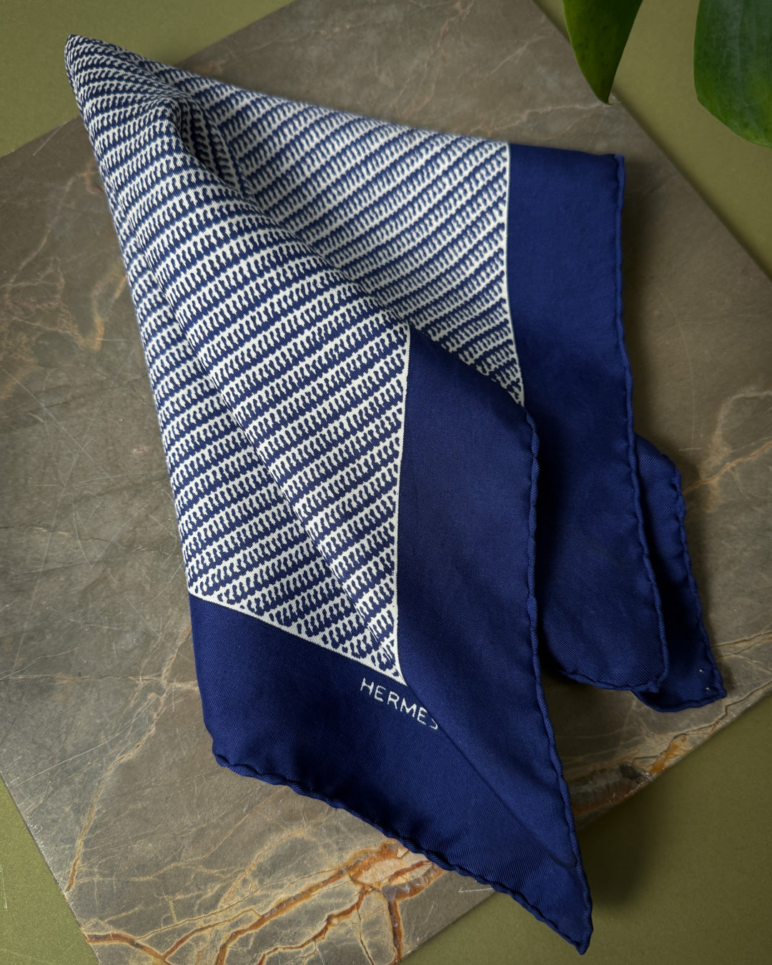 Vintage Hermes Petite Carre 45 - navy blue & white printed silk square scarf- a perfect small scarf, hankie or men's pocket square. Hand rolled hems. Made in France.
