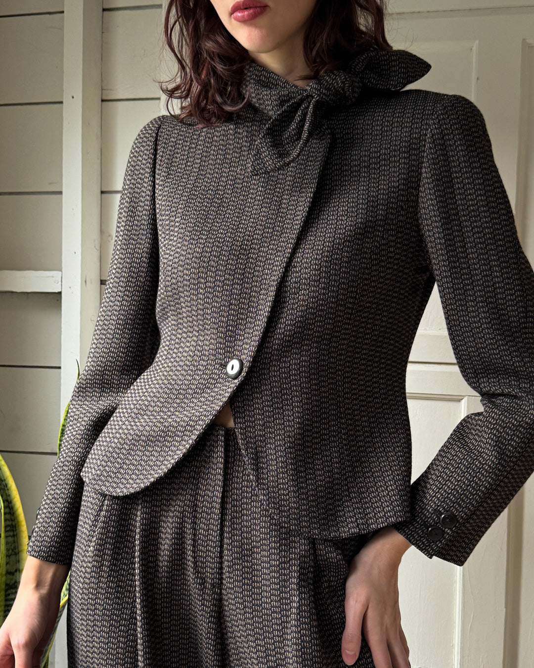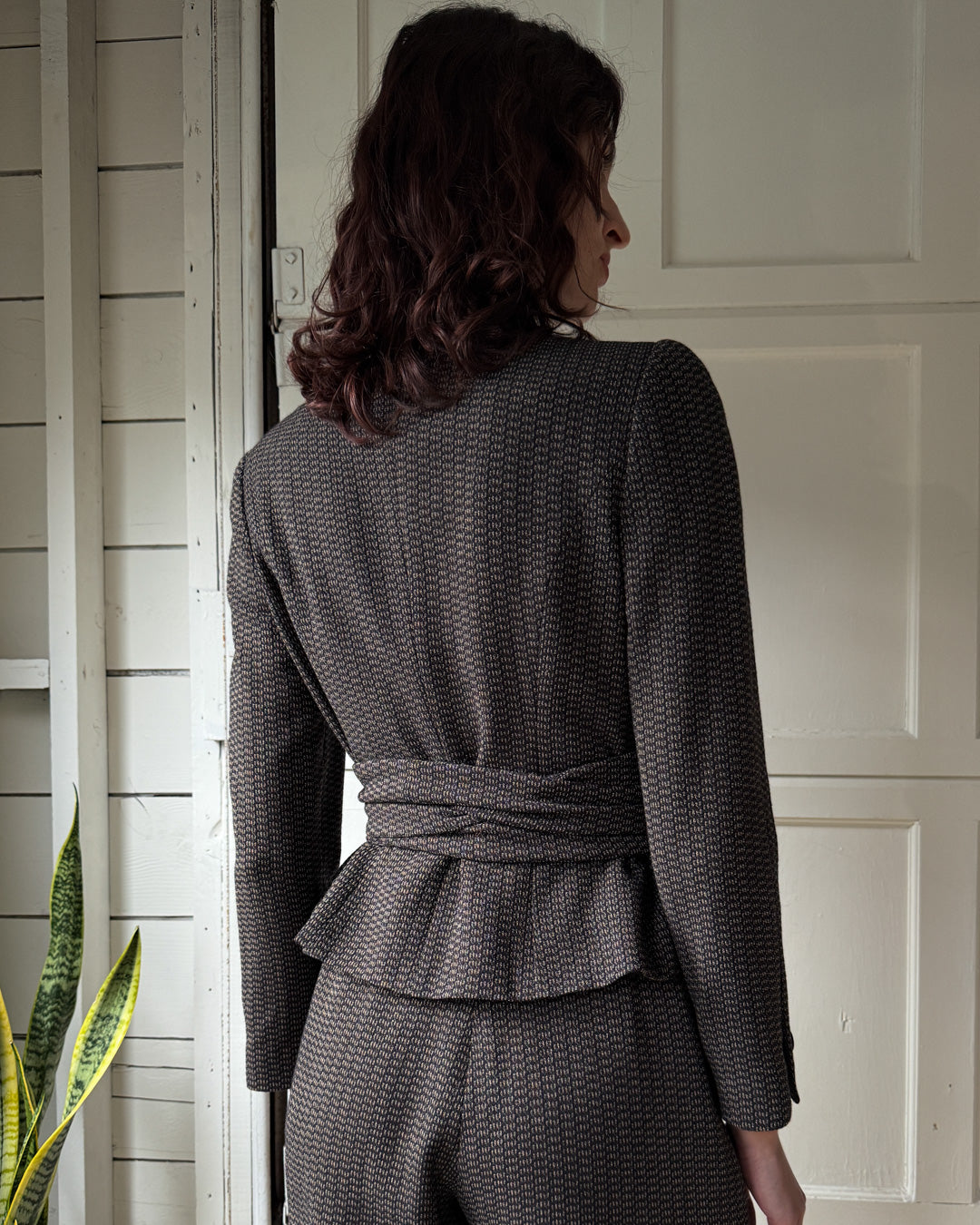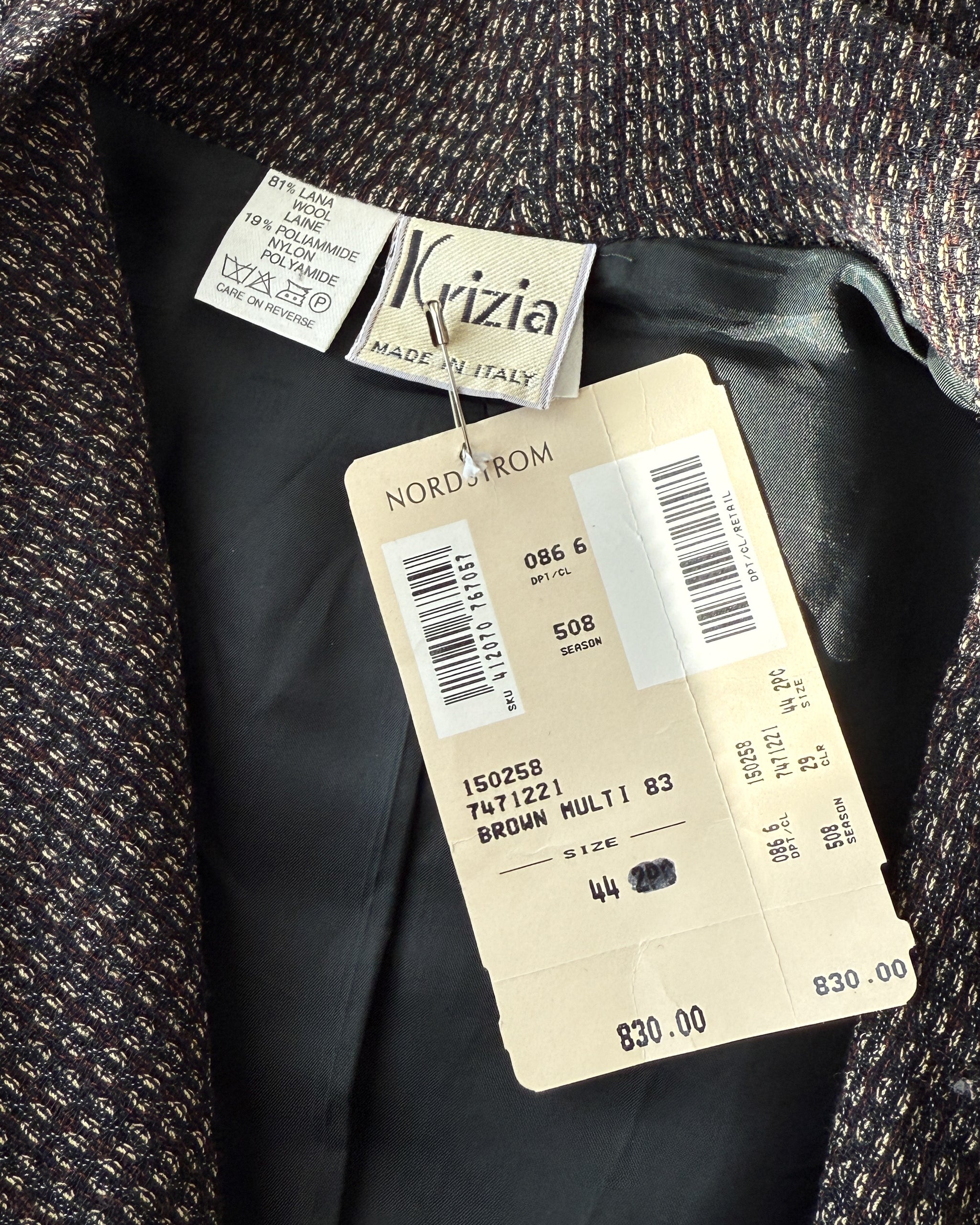Vintage unworn 1990s Krizia 3 piece wool pant suit including jacket, pants and belt.