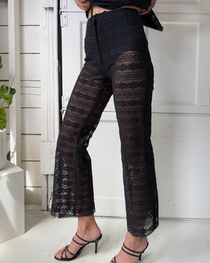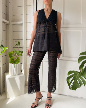 Vintage 1960s sheer black lace babydoll top and pants set.