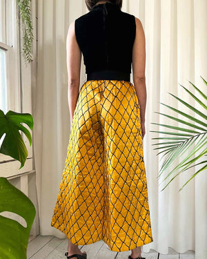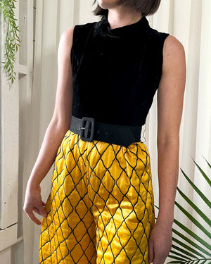 Vintage 1970s black velvet and quilted gold satin wide leg jumpsuit.