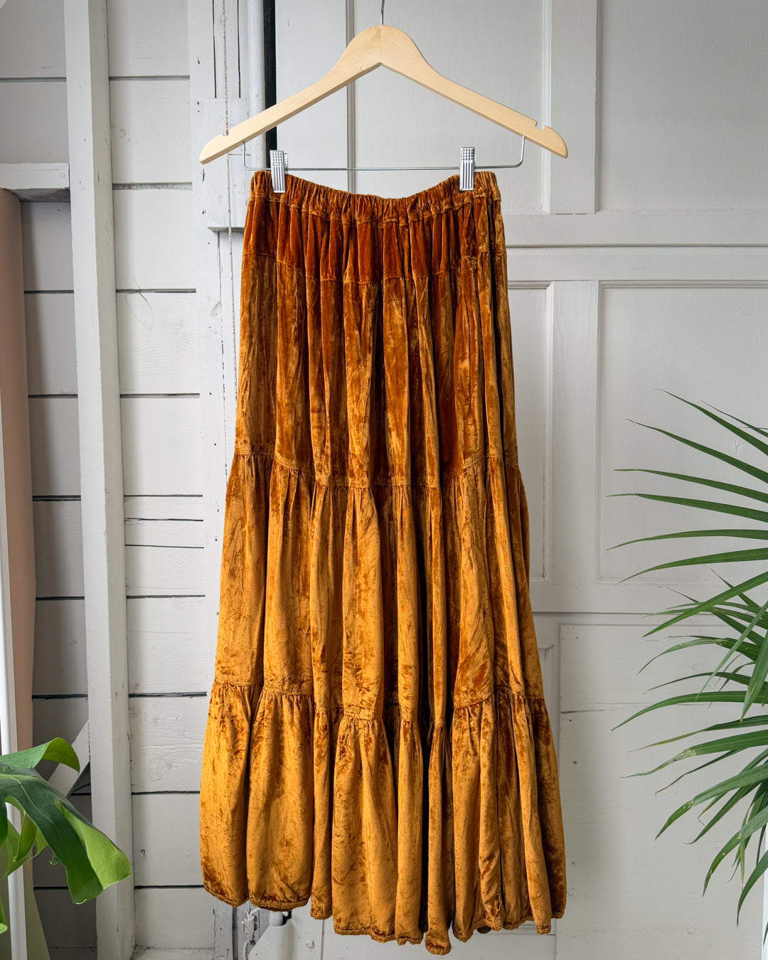 Vintage 1990s gold crushed velvet tiered midi skirt with elastic waistband.
