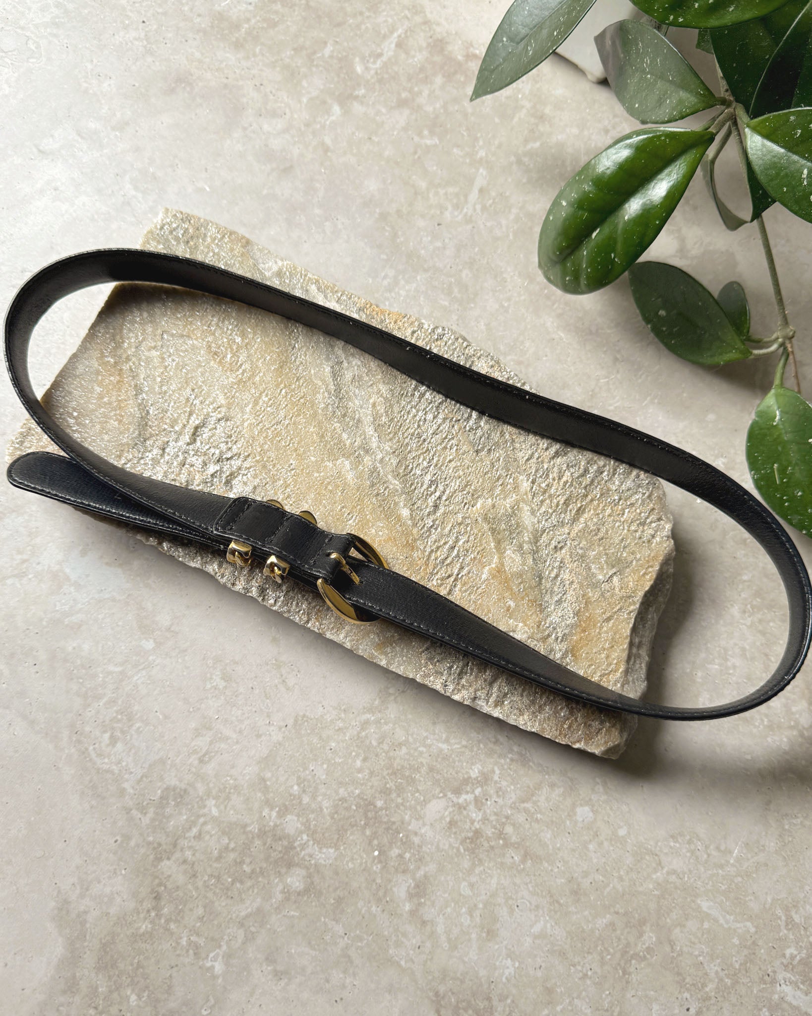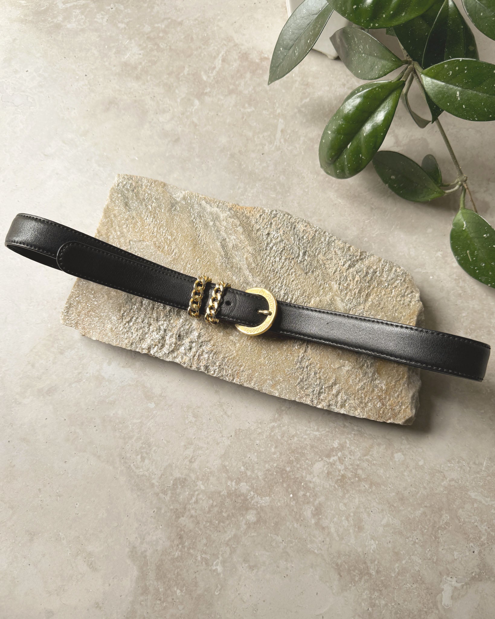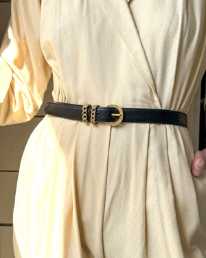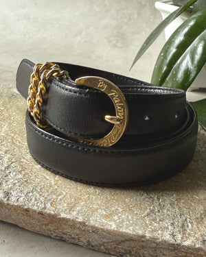 Vintage 1980s Paloma Picasso black leather belt with yellow gold tone metal buckle. Round engraved buckle with double chain loops. Adjustable prong closure.