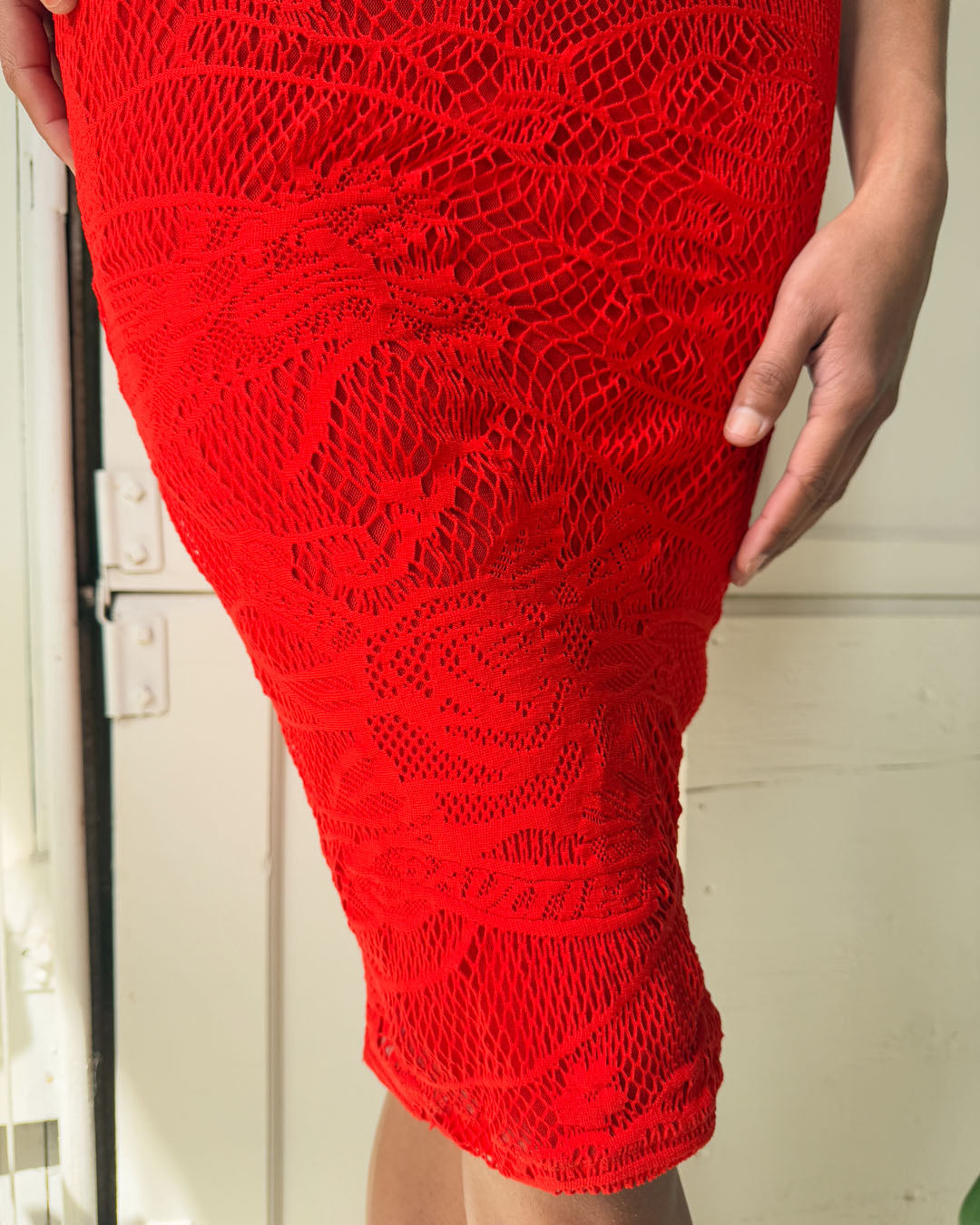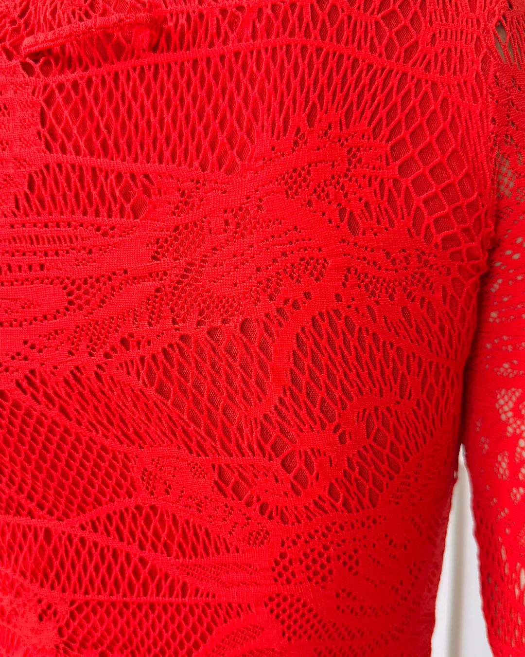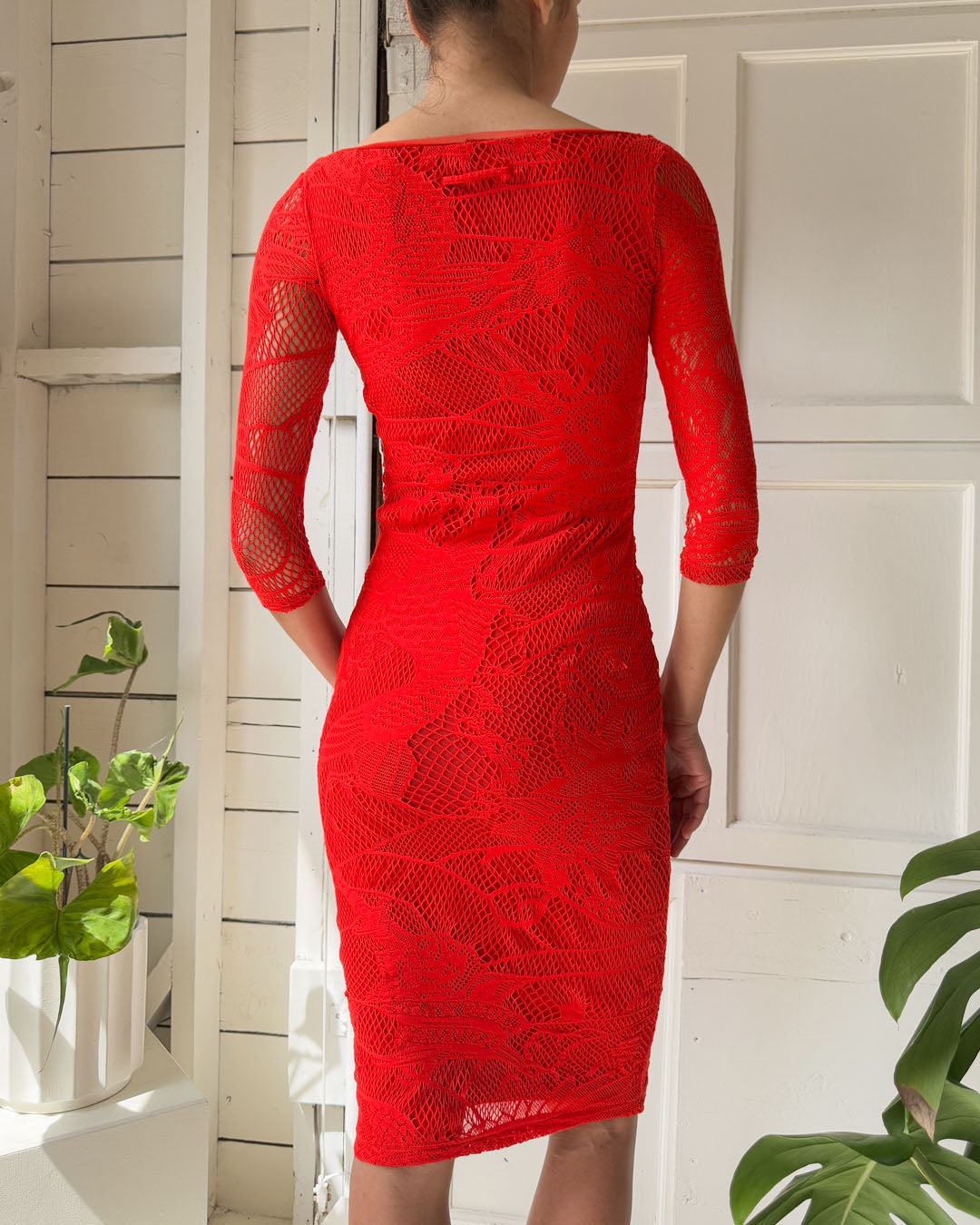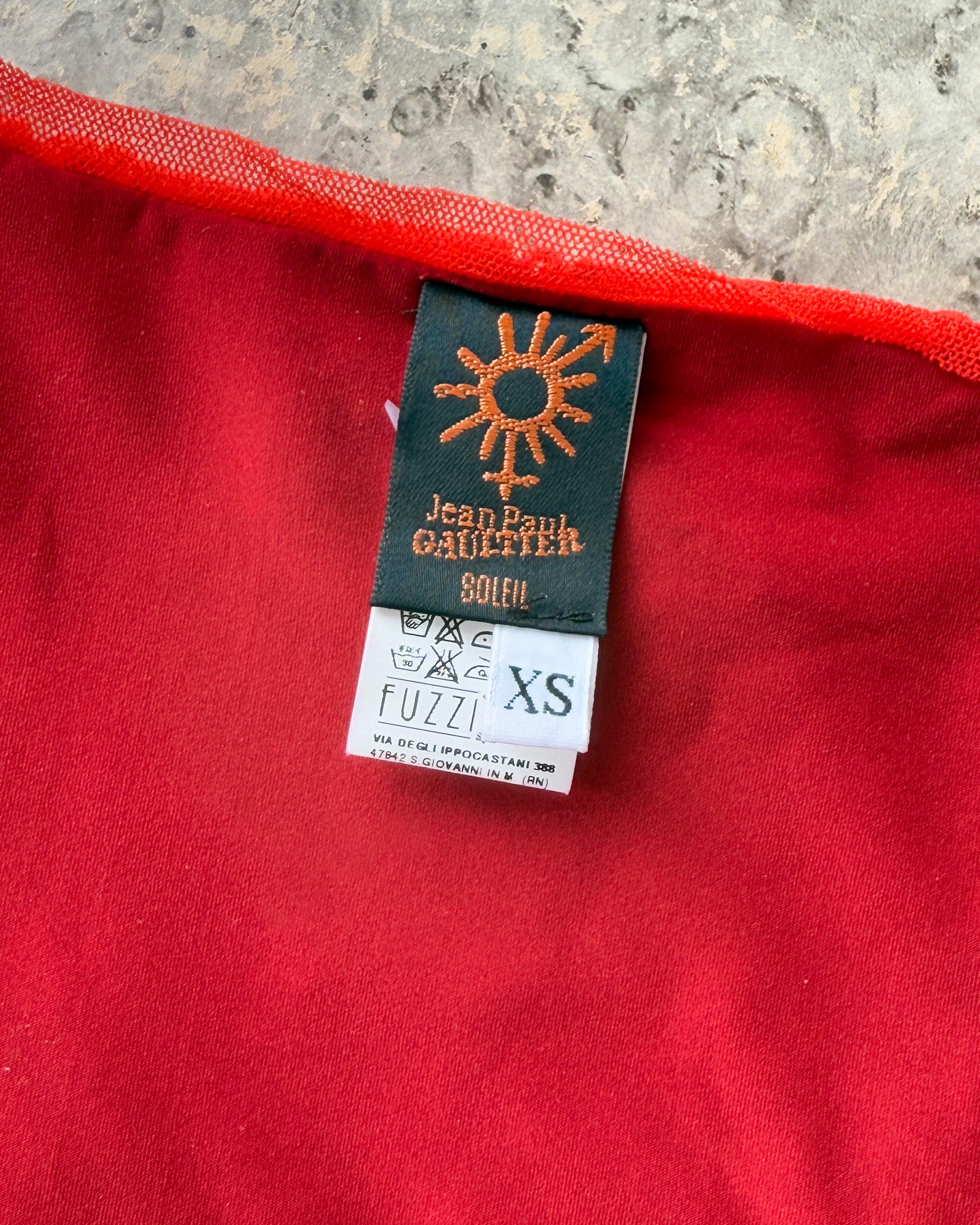 Vintage 1990s Jean Paul Gaultier red bodycon mesh dress with novelty dragon, koi fish and JPG logo pattern.