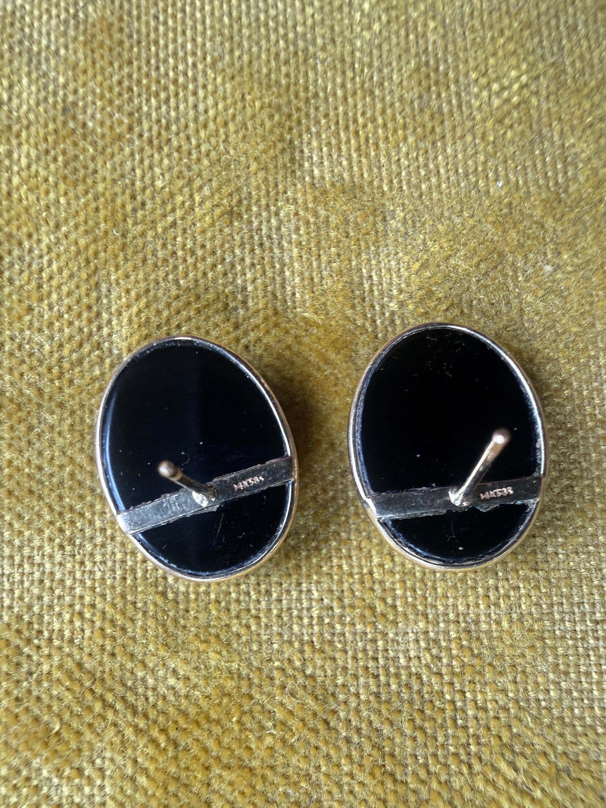 Vintage black onyx oval stone cabochon earrings set in 14 karat gold. 14 karat gold backs. Post backs for pierced ears.