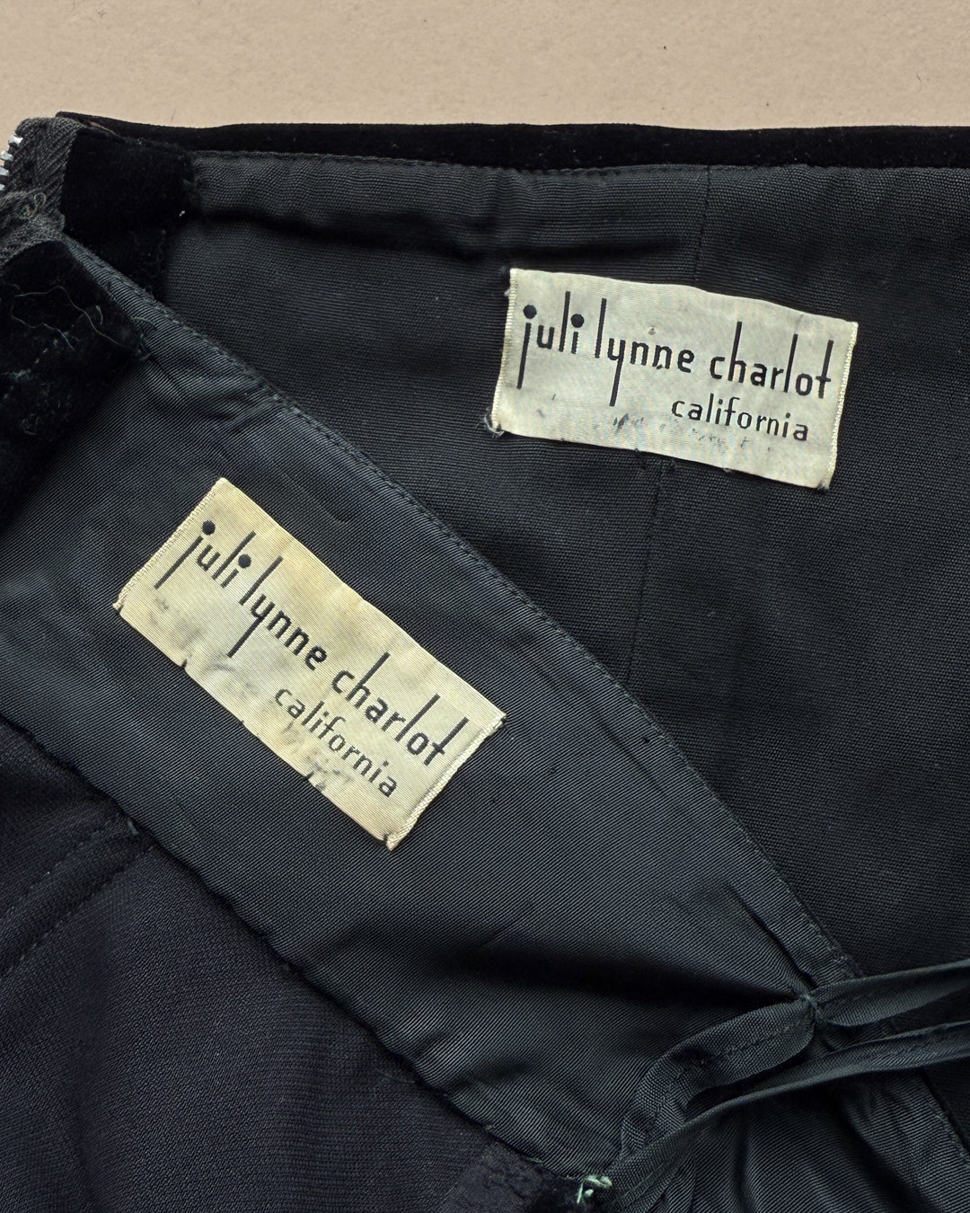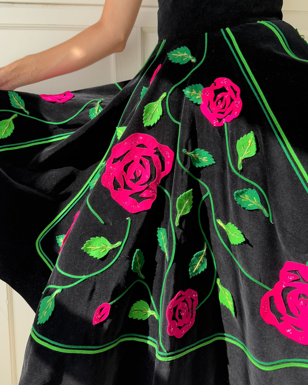 Rare vintage 1950s Juli Lynne Charlot black cotton velvet strapless top and circle skirt set with vibrant felt rose appliques.