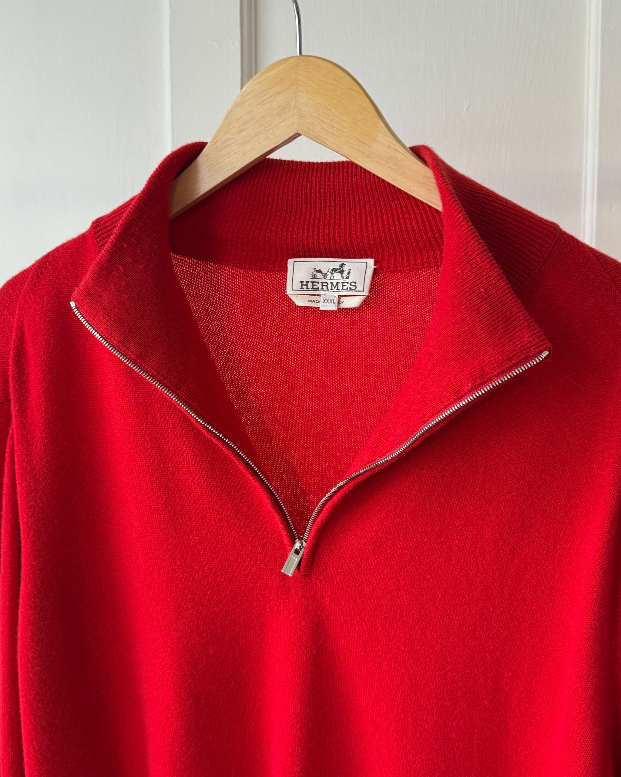 Authentic men's Hermès crimson red 100% pure cashmere knit pullover sweater. Mock neck with silver metal zipper closure. Unlined.