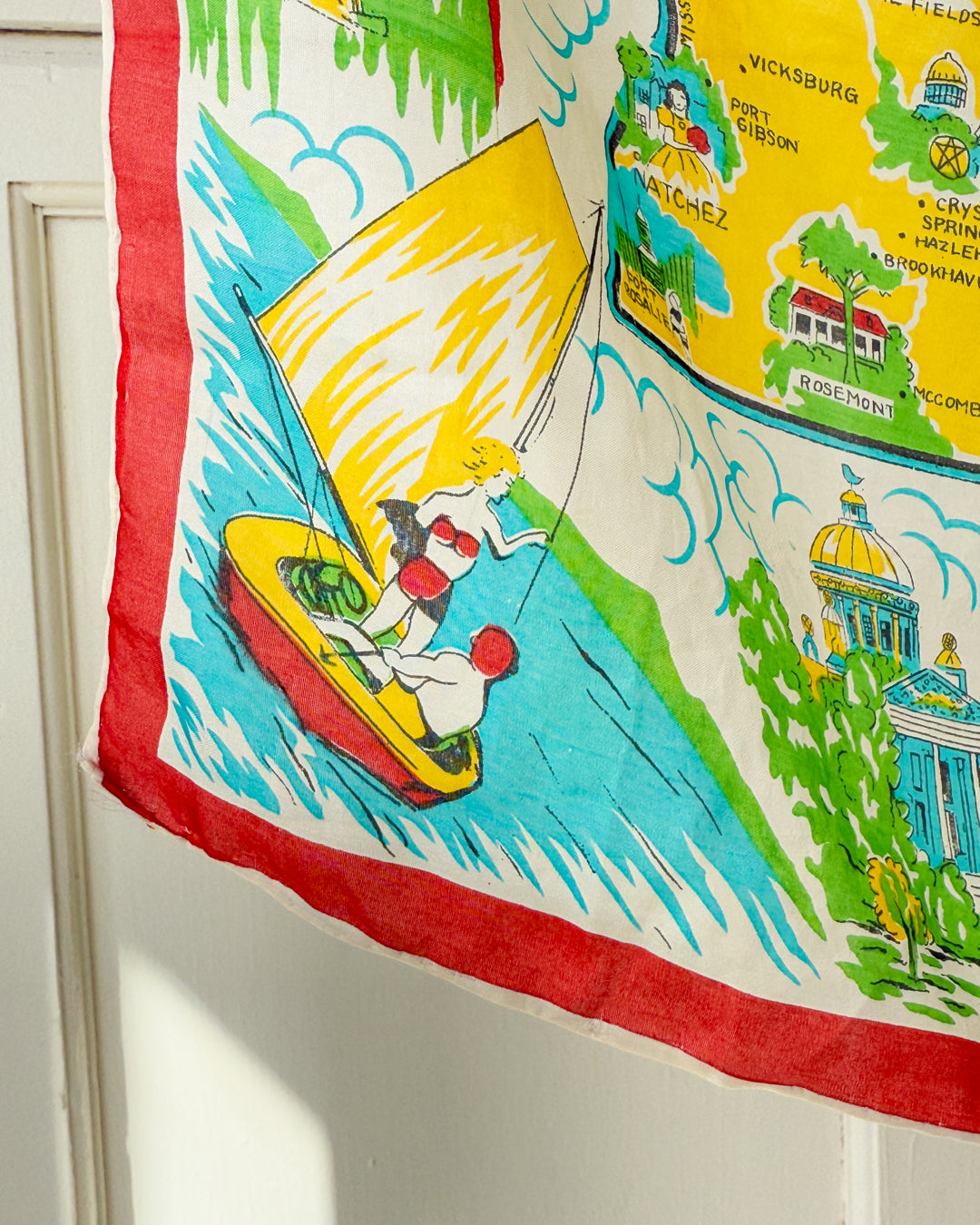 Vintage early 1950s Mississippi souvenir novelty print silk & rayon blend scarf. Small size. Bright red border and hand-rolled hems. 70% silk 30% rayon. Made in Japan.