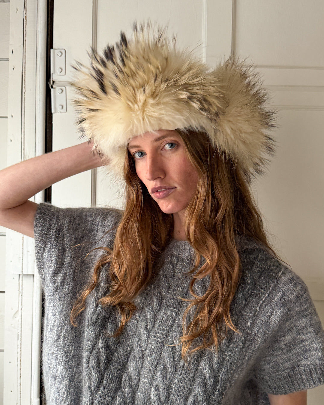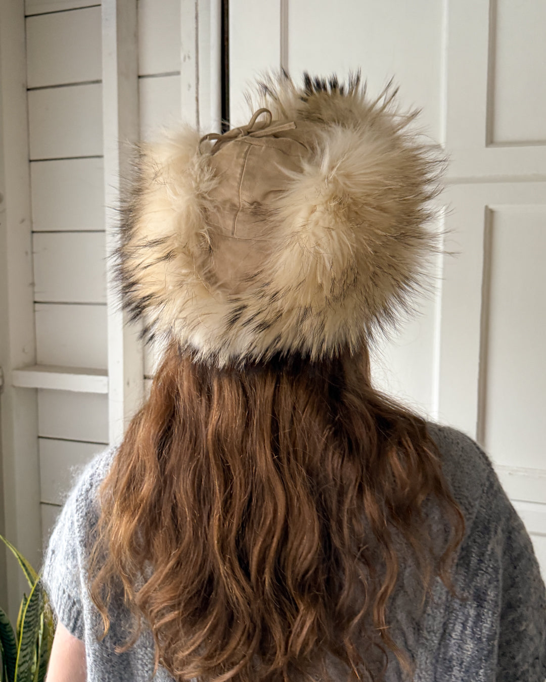 Vintage genuine extra fluffy coyote fur trapper style ushanka hat. Fully lined in ivory velvet. Wrap around ear flaps that can be tied up.
