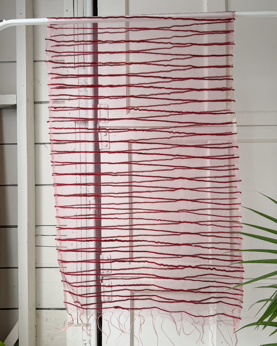 Vintage sheer mauve silk shawl with thin cranberry wool stripes. Knotted fringe hems.