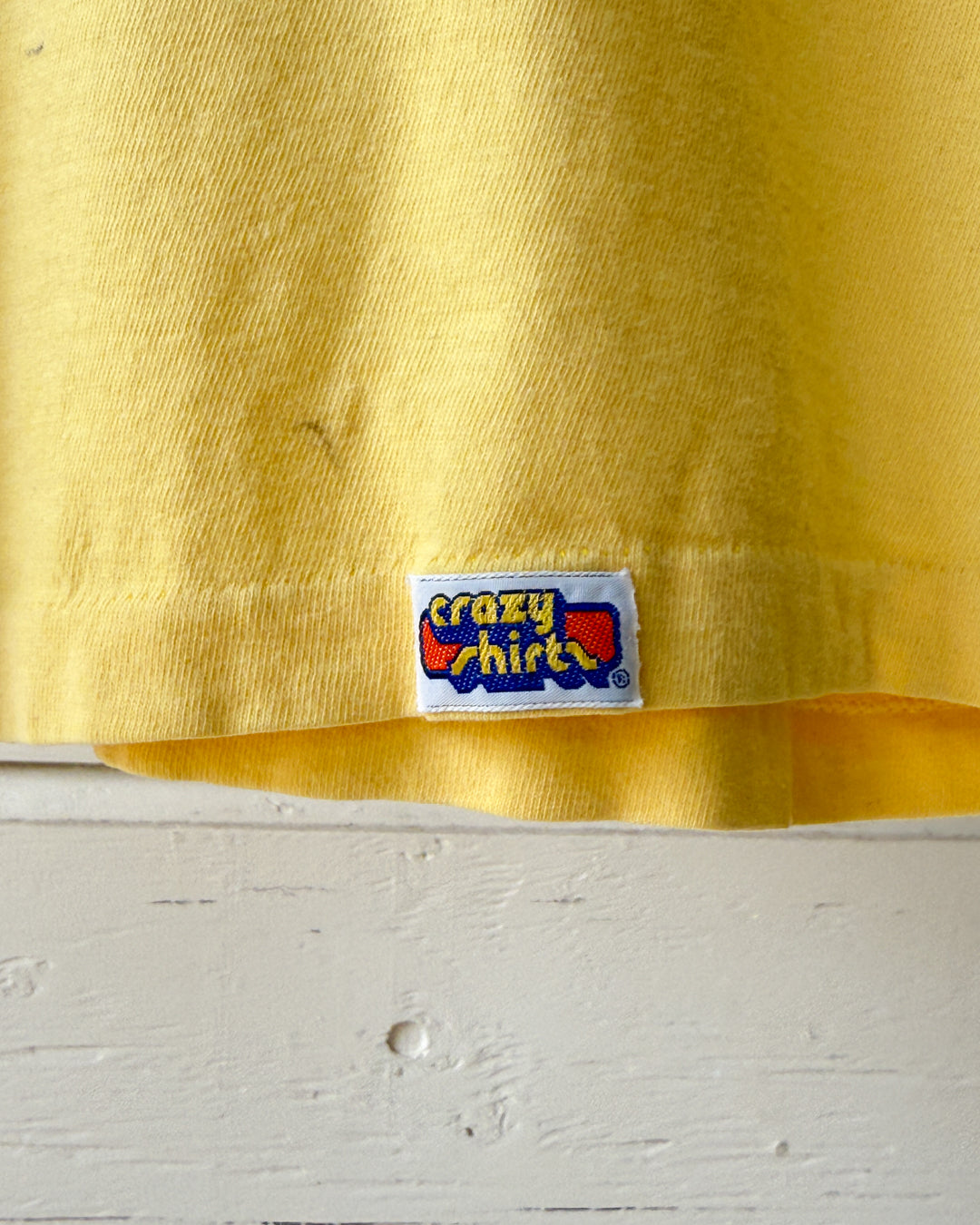 Vintage 1977 Hawaii graphic tee with front and back palm tree silhouette wraparound print. Yellow 100% cotton. Made in USA.