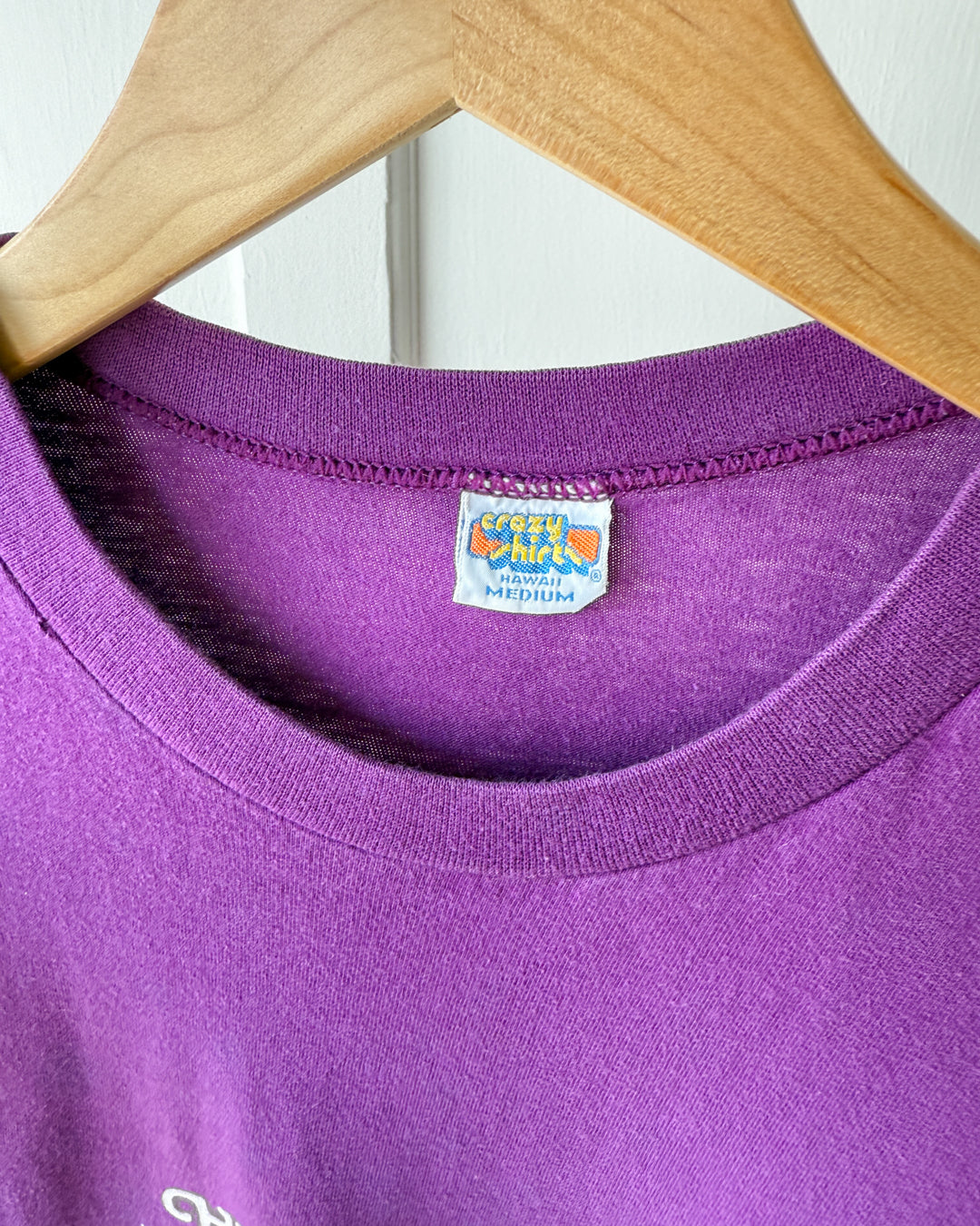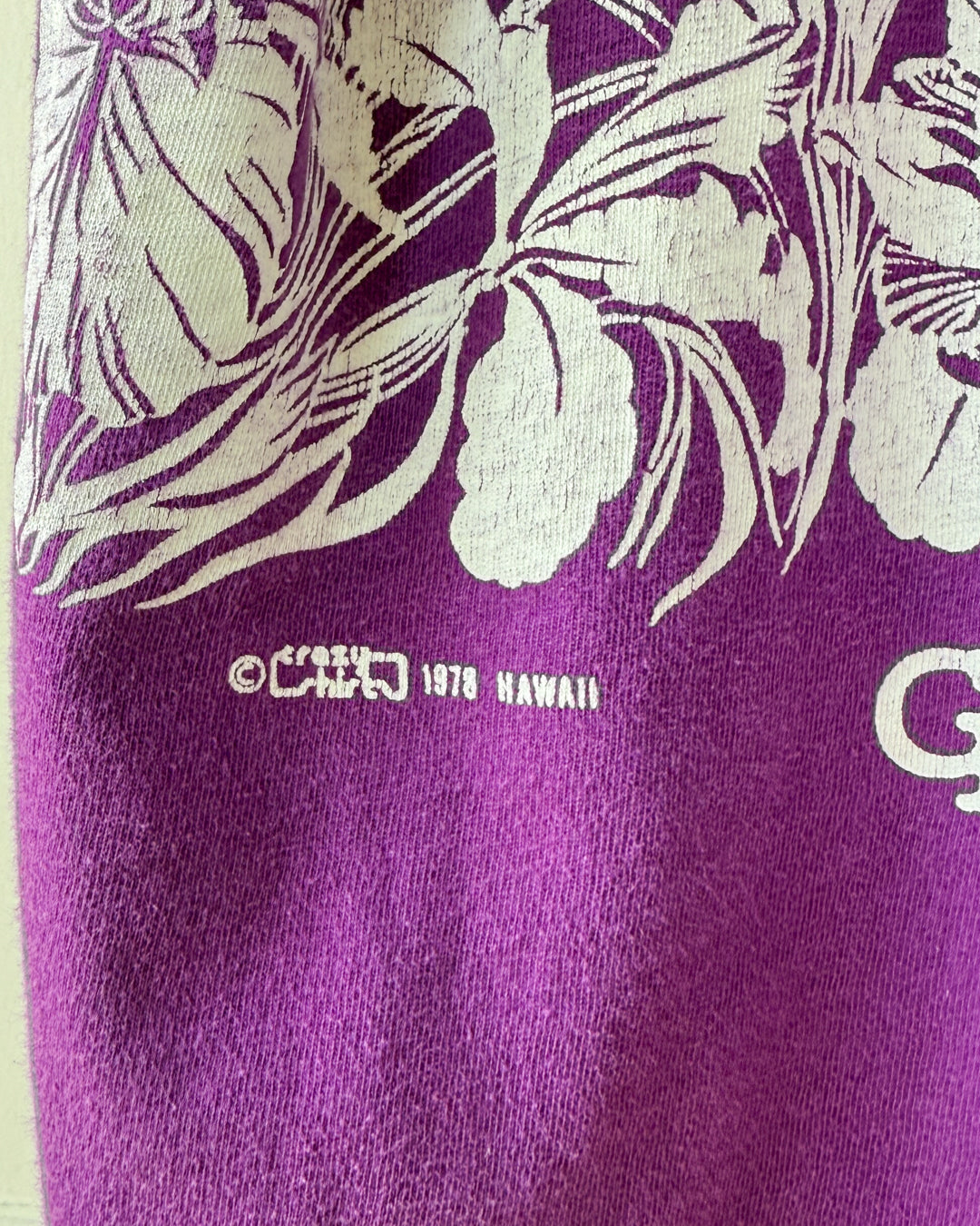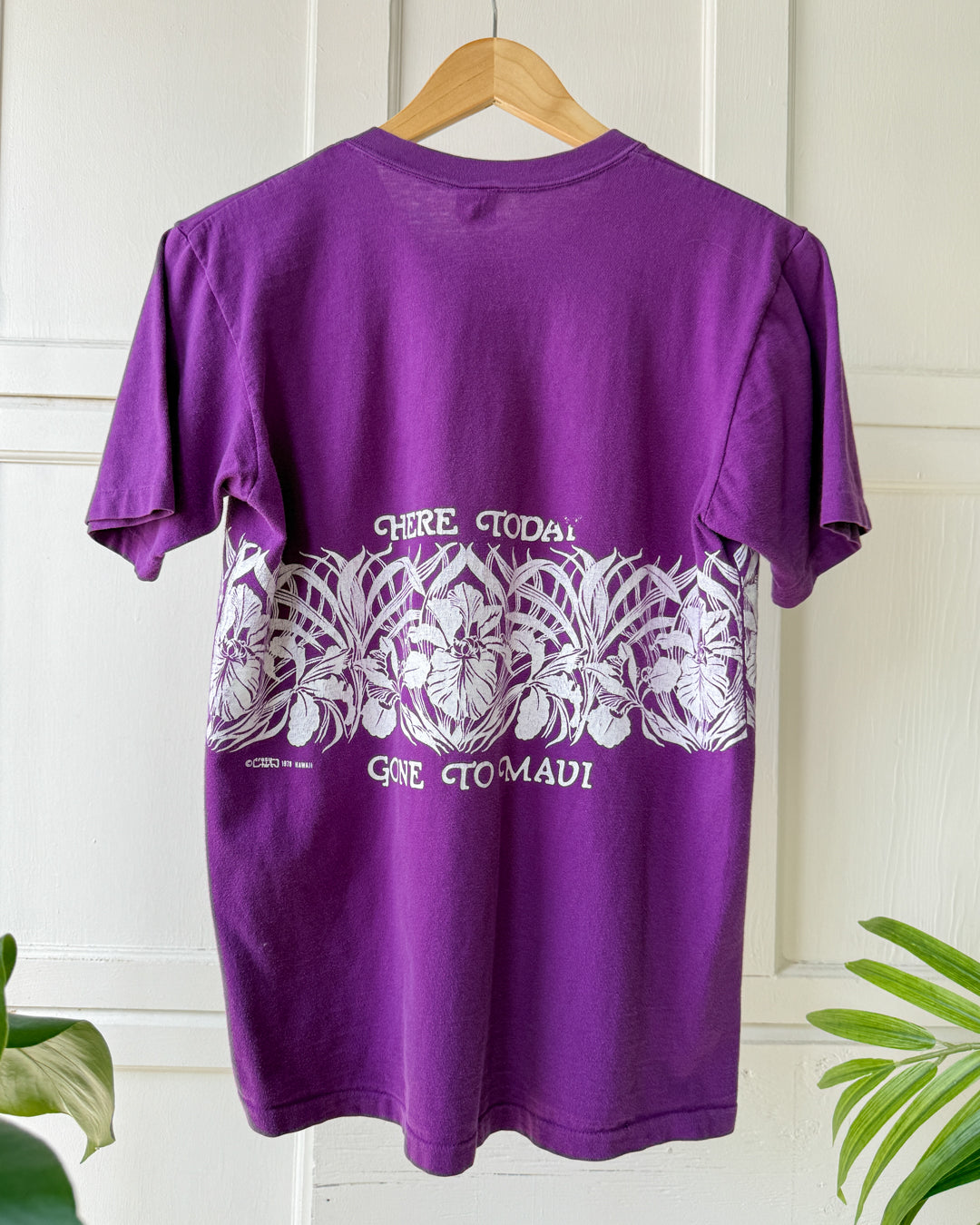 Vintage 1978 "Here Today Gone To Maui" novelty front & back print tee. Purple 100% cotton. Made in USA.