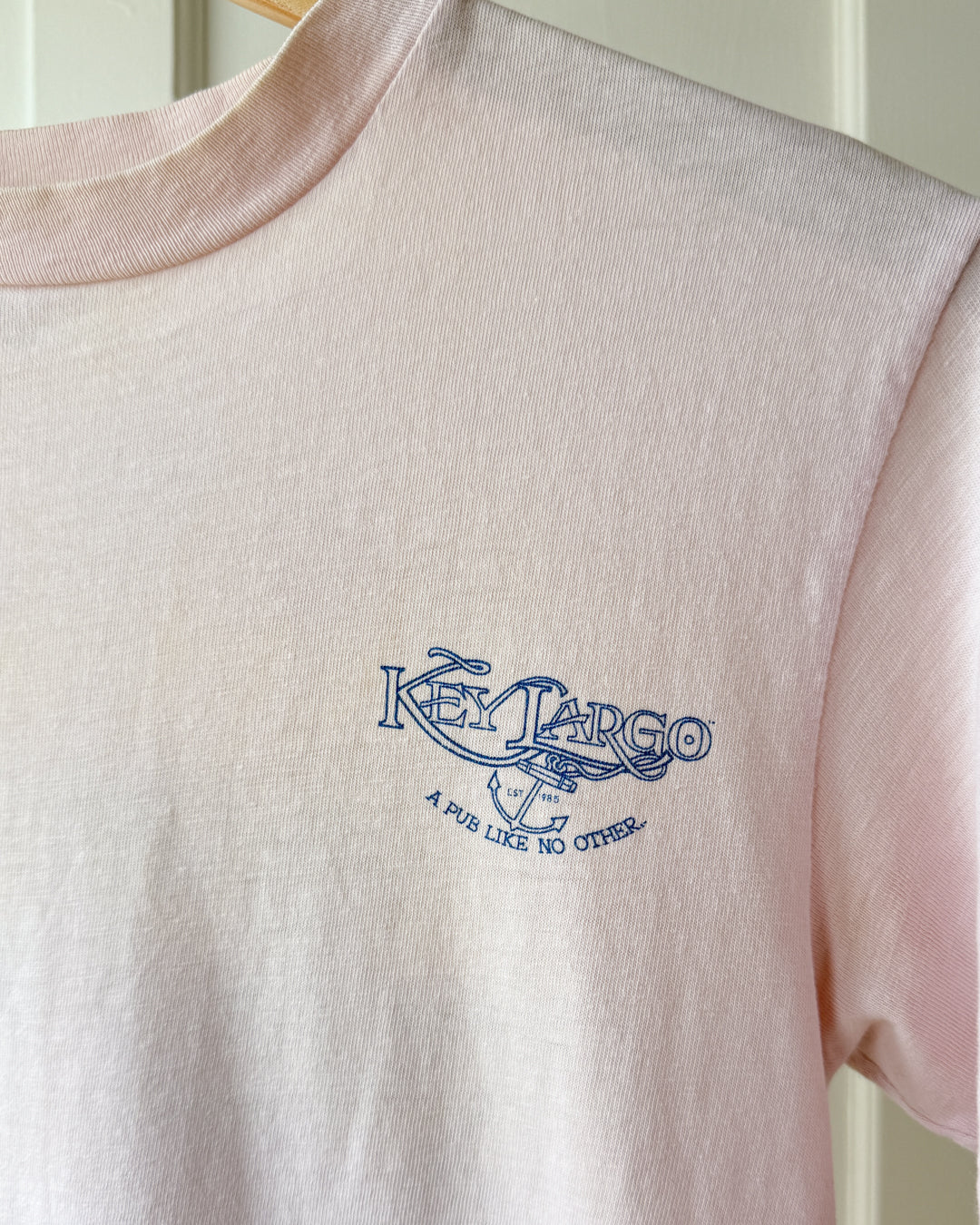 Vintage 1980s Key Largo Waikiki front & back graphic print tee. Faded pink 100% cotton. Made in USA.