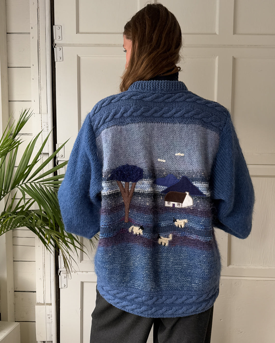 Vintage 1980s hand knit mohair blend cardigan sweater with a scenic novelty farm pattern.