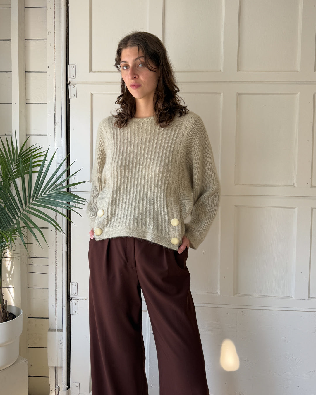 Vintage 1980s Italian greenish-gray mohair blend knit pullover sweater with button details.