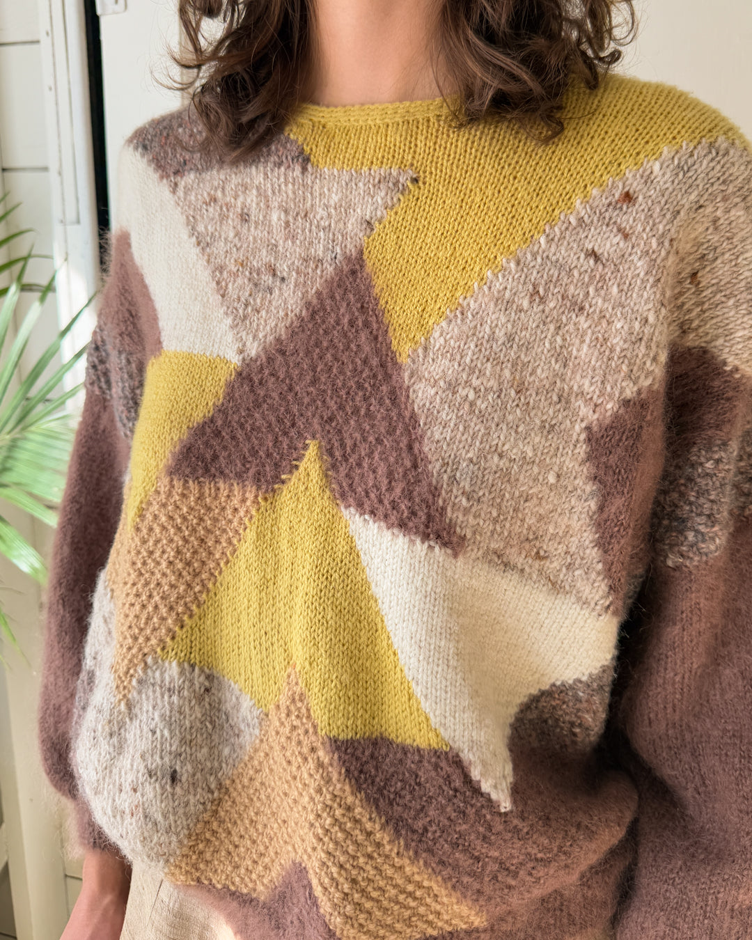 Vintage 1980s hand knit mixed yarn geometric pattern sweater with fluffy mohair sleeves.