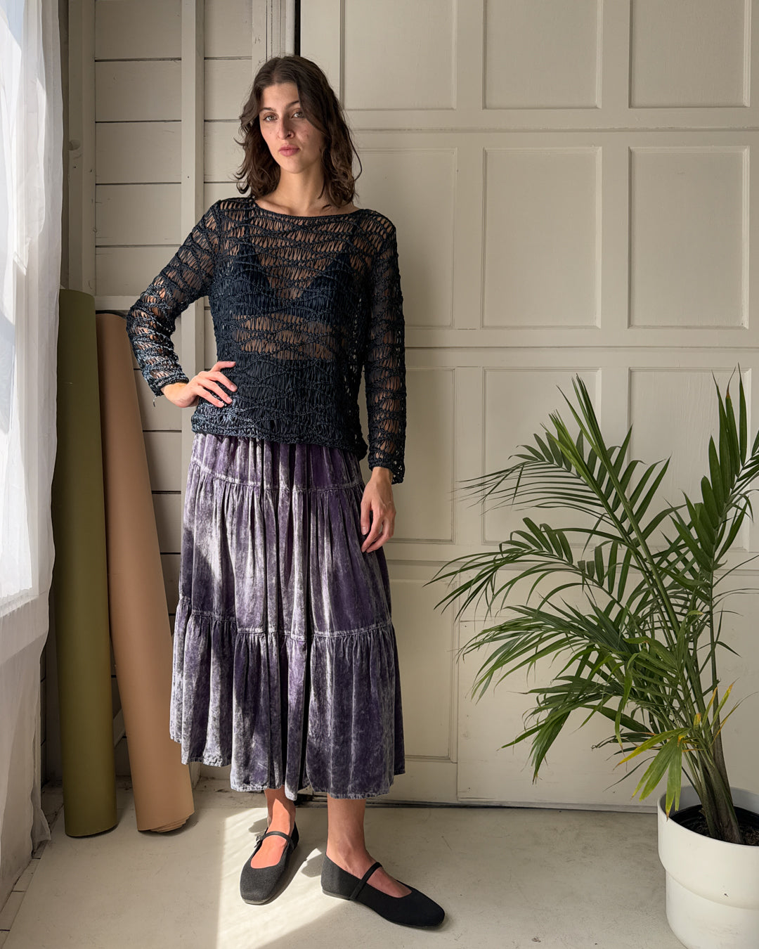 Shown here with our 90s Periwinkle Crushed Velvet Skirt