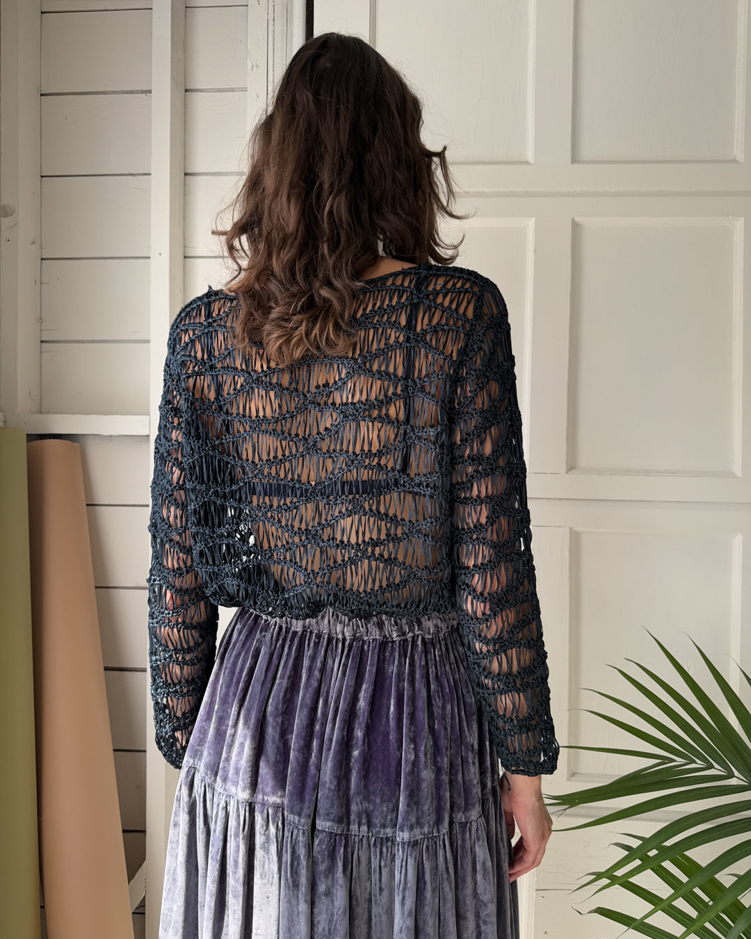 Vintage 1980s midnight blue shimmery ribbon crochet long sleeve top.